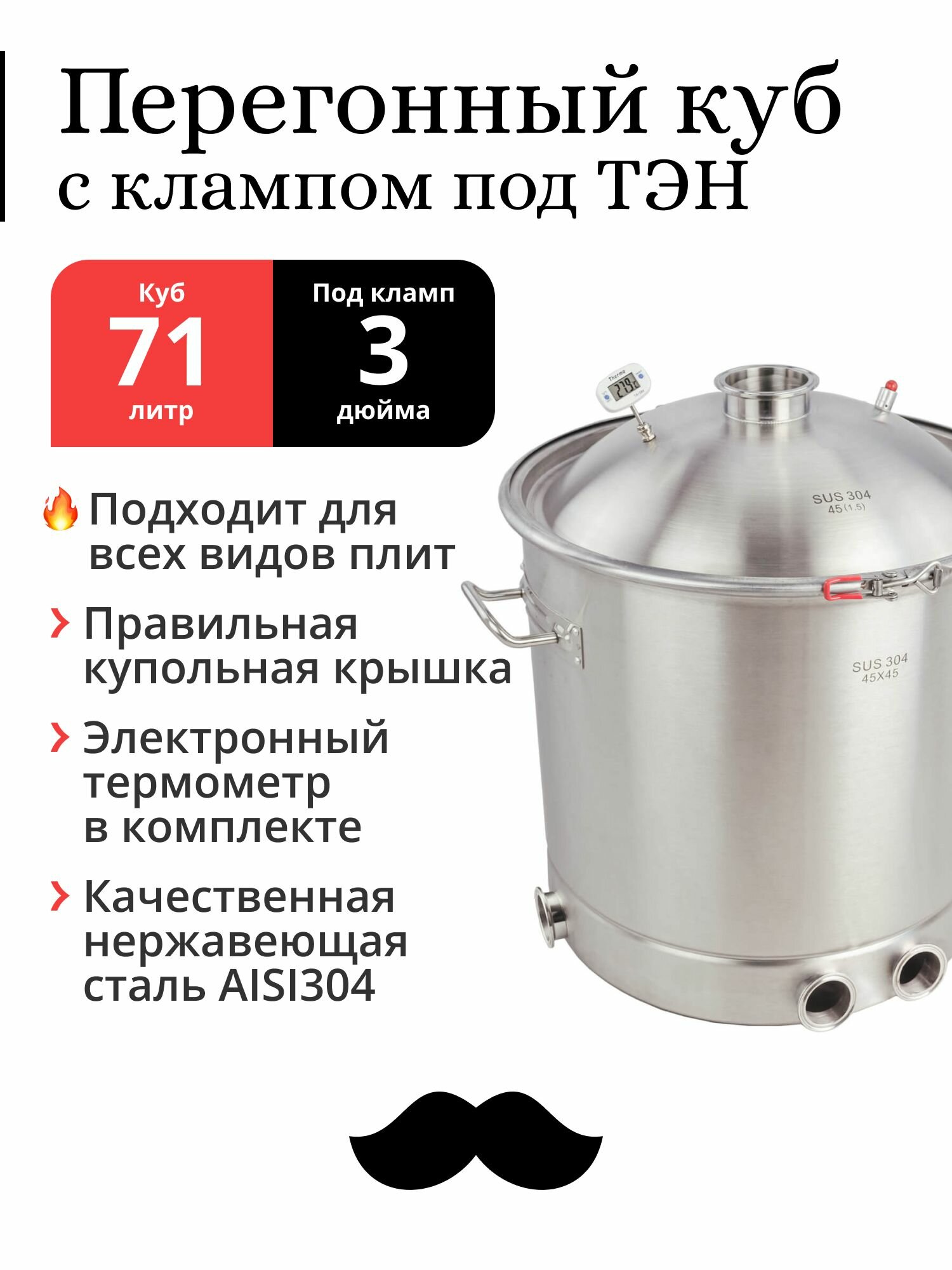 Перегонный куб 70 / 71 литр с клампом под кран 2 дюйма, 45х45 см, 304-я сталь, 2 клампа под ТЭН, под колонну 3 дюйма интересное: