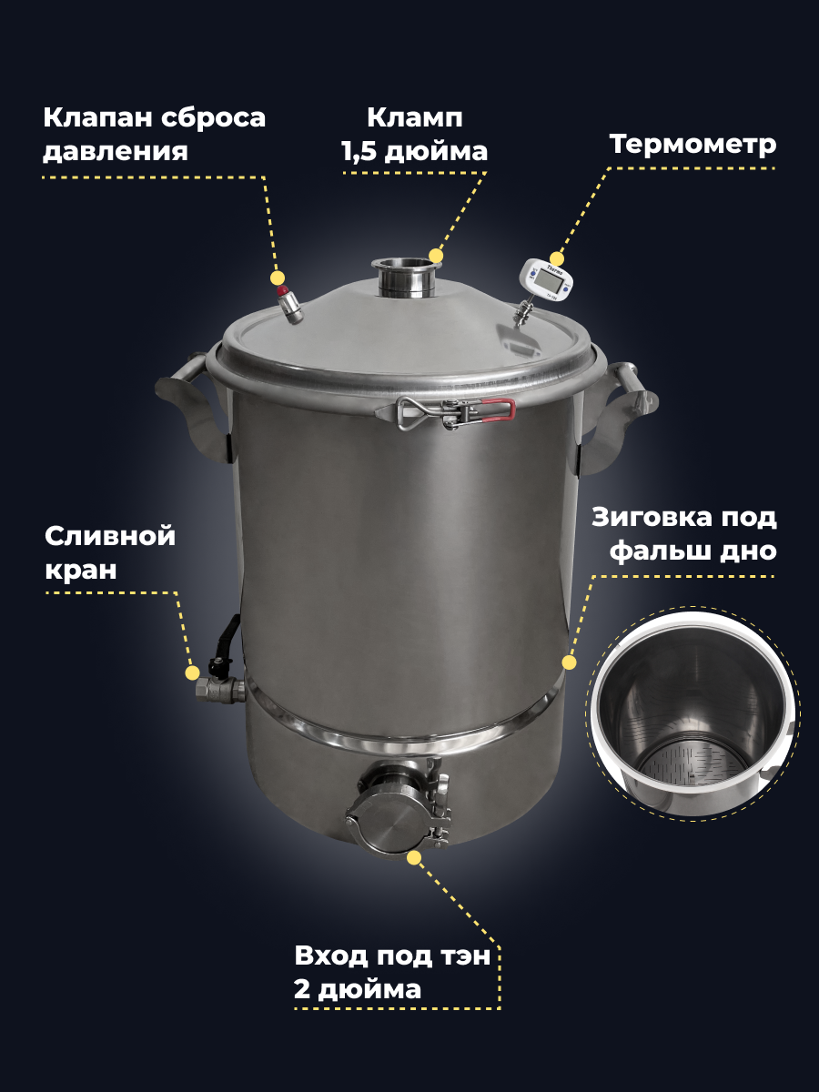 | Подробная комплектация | Перегонный куб, кран для слива, фальш-дно, клапан безопасности |