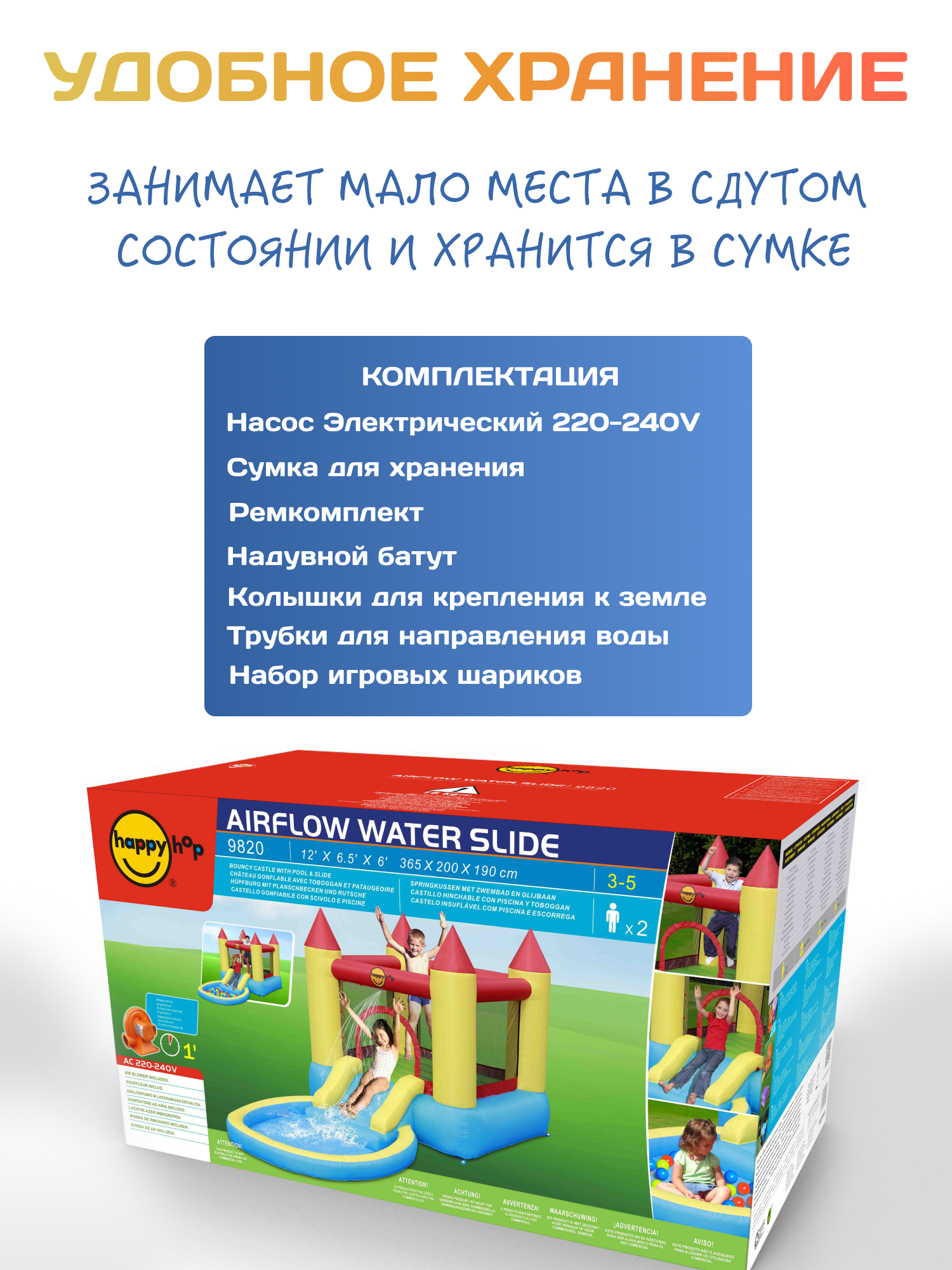 | Комплектация | Надувной батут, насос, колышки для крепления к земле, пластиковые шарики, ремкомплект, сумка для хранения и перевозки, инструкция, трубки для подведения воды |