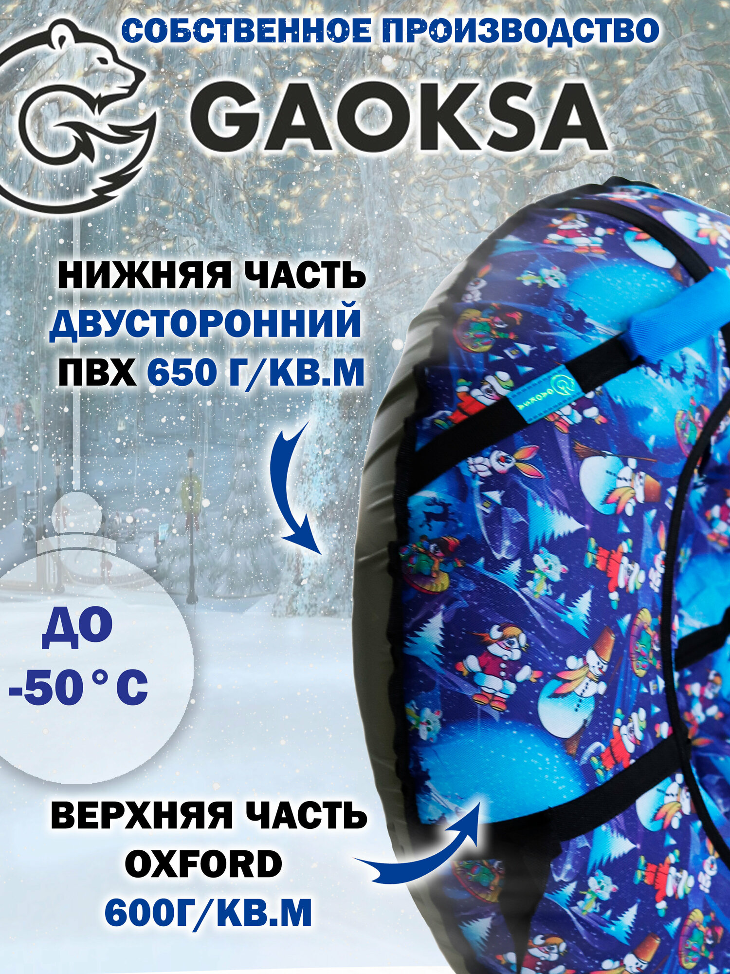 Тюбинг ватрушка 100 см с ручками и буксировочным тросом GAOKSA / Гаокса, санки детские для катания с горок с чехлом, камерой и мешочком для хранения