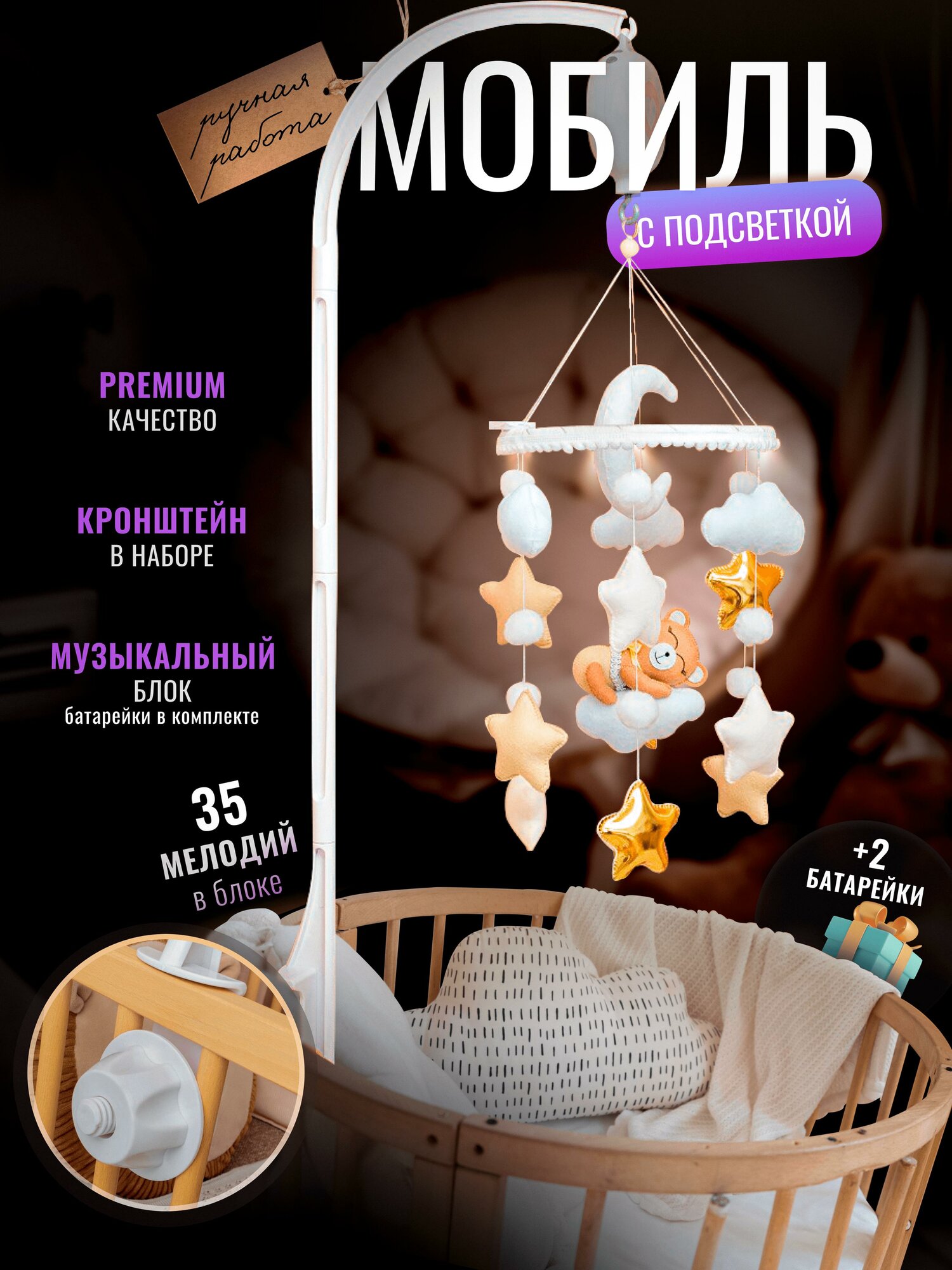 Мобиль в кроватку для новорожденных с музыкальным блоком и кронштейном