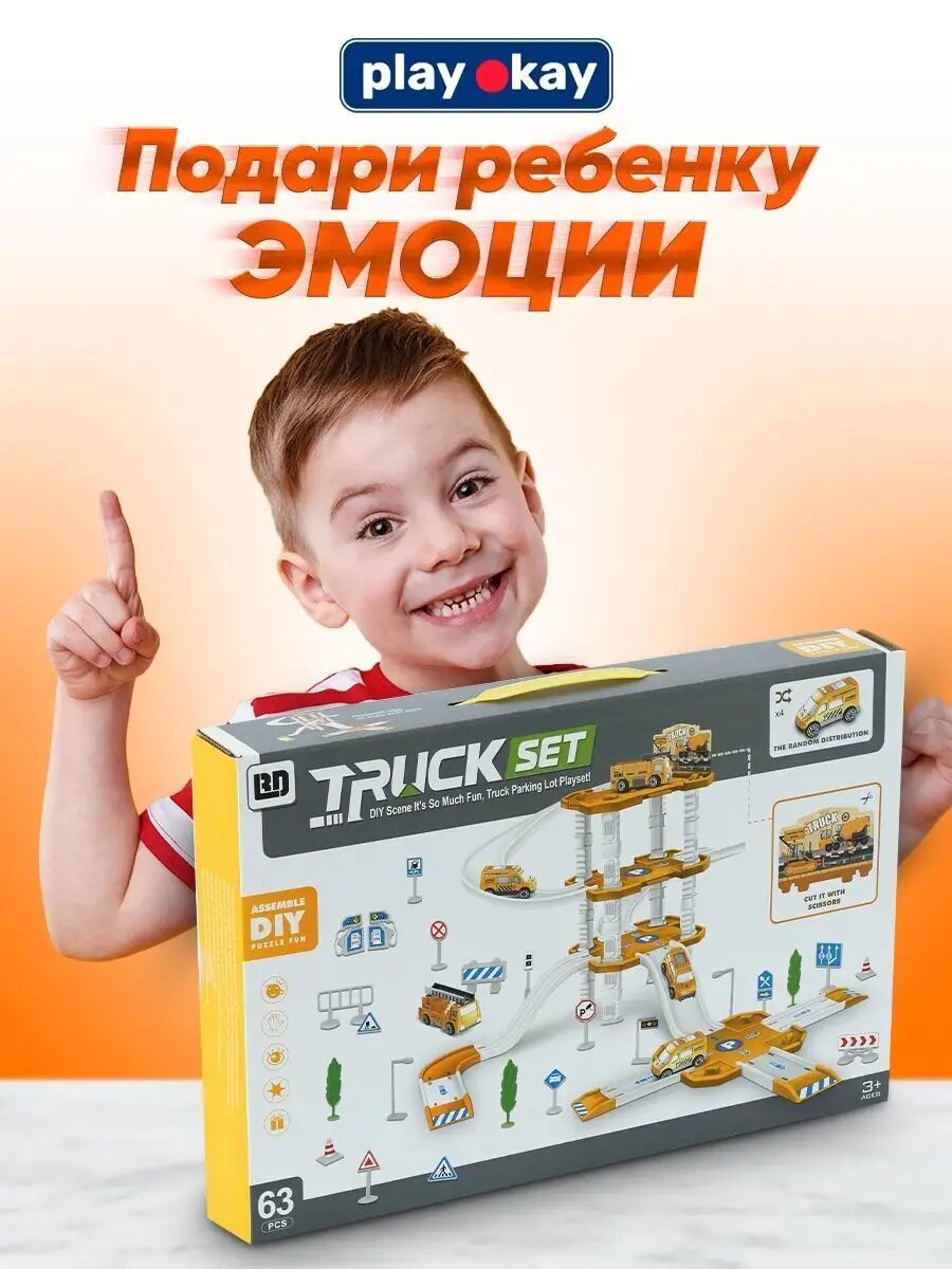 Парковка для машинок многоуровневая Play Okay Parking Fire, гараж детский с горкой и наклейками + дорожные знаки, Конструктор для мальчиков (игровой набор пожарной техники Паркинг) / 63 детали