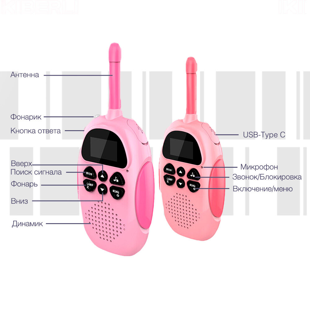 СохранитьKIBERLI H1 Комплект игровых раций для детей 10 мелодий, радионяня дальность 3 км. Детские рации, розовый интересное: