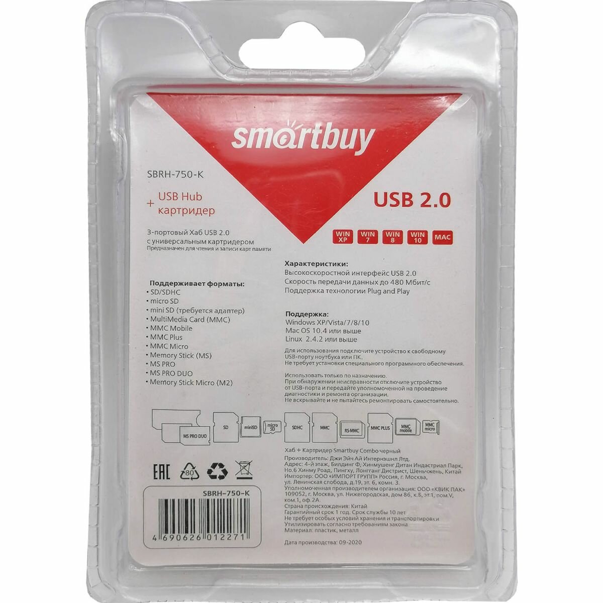 Картридер USB2.0 Smartbuy SBRH-750-K, черный