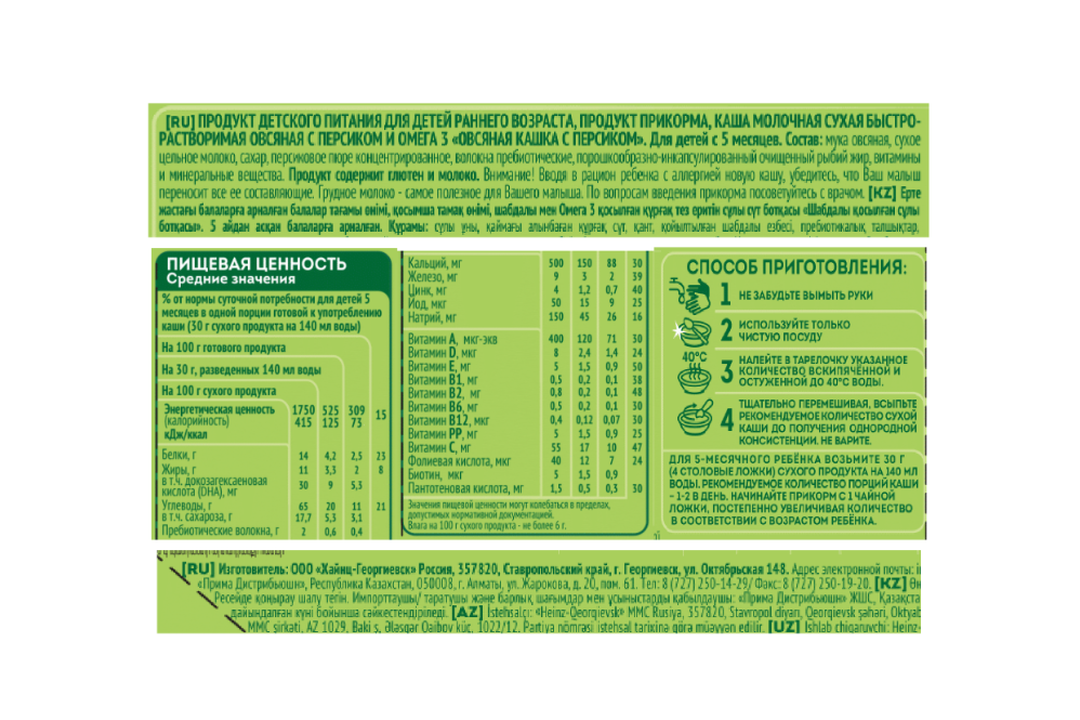 | Состав | овсяная мука, сухое цельное молоко, сахар, персиковое пюре концентрированное, волокна цикория пребиотические (инулин), порошкообразно-инкапсулированный рыбий жир, витамины и минеральные вещества |