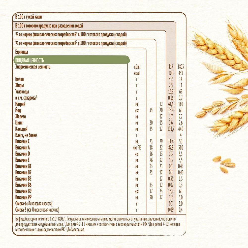 | Состав | мука (пшеничная (56,2%) (содержит глютен), овсяная (7,8%) (содержит глютен), рисовая (1,9%), кукурузная (1,9%)), молоко сухое обезжиренное (16,5%), смесь растительных масел (низкоэруковое рапсовое, подсолнечное высокоолеиновое, подсолнечное), антиокислители (L-аскорбилпальмитат, альфа-токоферол, лимонная кислота), кусочки абрикоса (2,6%) (абрикос, сахар,крахмал кукурузный), порошок меда (2,6%) (мальтодекстрин, мед), минеральные вещества (кальция карбонат, железа (II) фумарат, цинка сульфат, йодид калия), витамины (С (L-аскорбиновая кислота), E (DL-альфа-токоферола ацетат), РР (никотинамид), B5 (D-пантотенат кальция), A (ретинола ацетат), В1 (тиамина мононитрат), В6 (пиридоксин гидрохлорид), В2 (рибофлавин), B9 ( фолиевая кислота), D (D3 холекальциферол)), бифидобактерии не менее 1х10^6 КОЕ/г |
