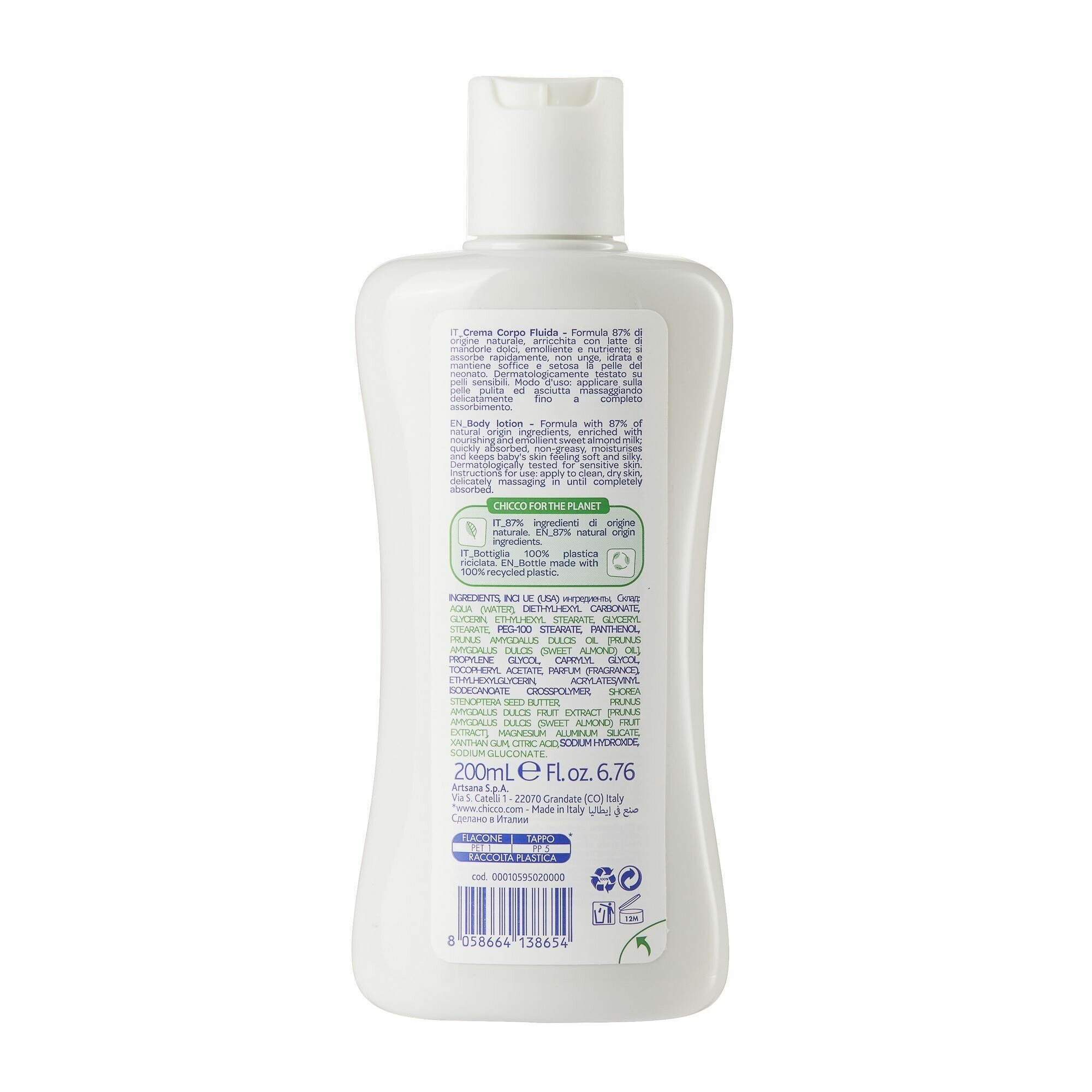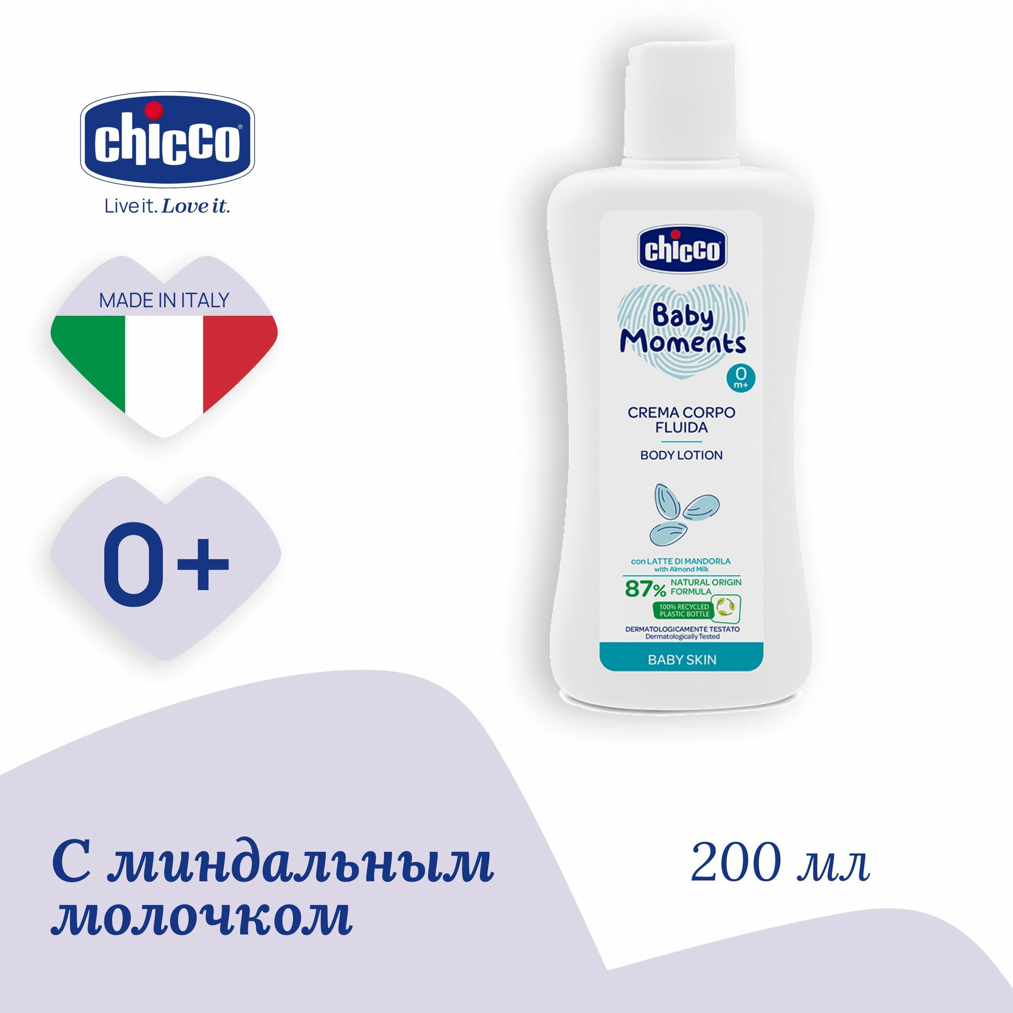 Увлажняющее детское молочко для тела Chicco Baby Moments Лосьон для новорожденных 200 мл с молочком миндаля 0+ интересное: