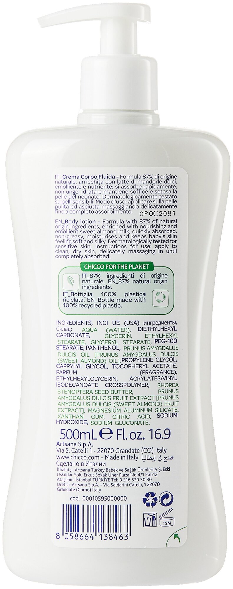 Увлажняющее детское молочко для тела Chicco Baby Moments Лосьон для новорожденных 500 мл с молочком миндаля 0+ интересное: