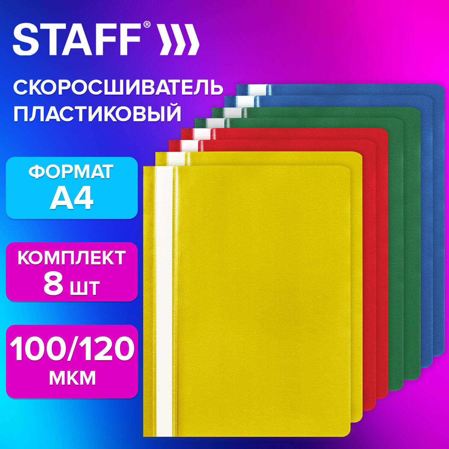 Папка для документов а4 скоросшиватель, комплект 8 штук ассорти, Staff, 271953