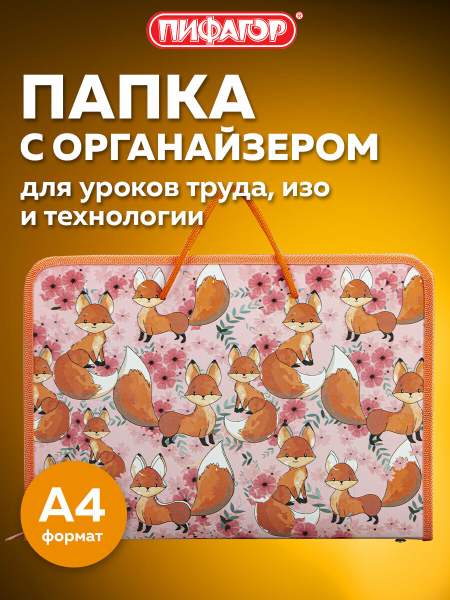 Папка для труда на молнии с ручками пифагор А4, 1 отделение, пластик, органайзер, "Foxes", 270876