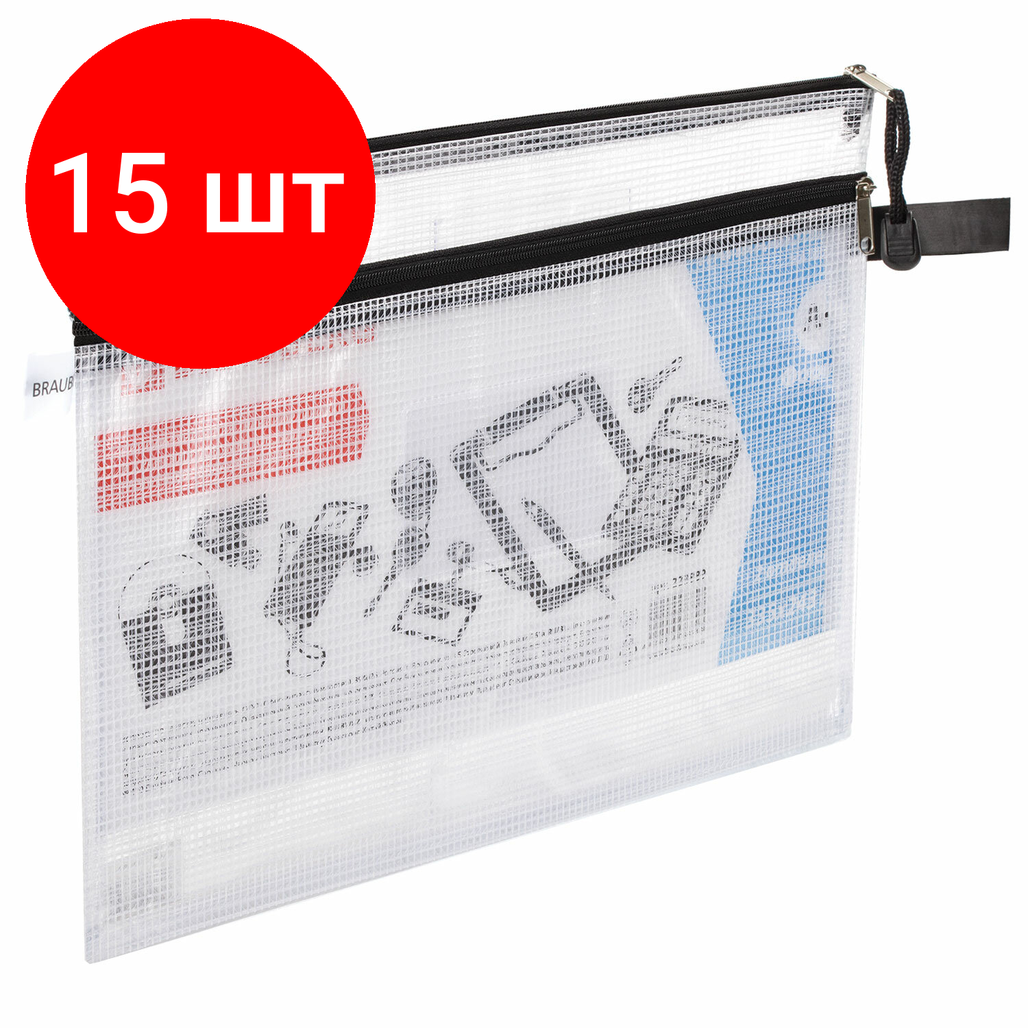 Купить Комплект 15 шт, Папка-конверт на молнии А4 (335х243 мм), 2 отделения, ПВХ, прозрачная, 0.3 мм, BRAUBERG "Solid", 223889