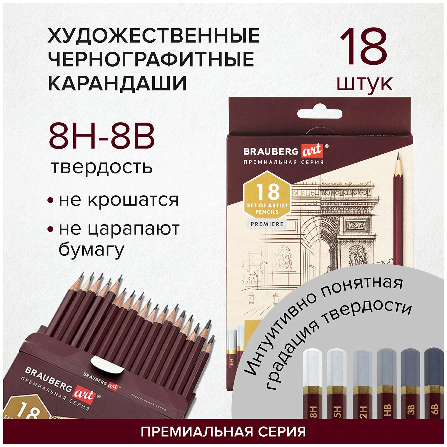 Карандаши чернографитные профессиональные 8H-8B набор 18 штук, BRAUBERG ART "PREMIERE", 181893 интересное: