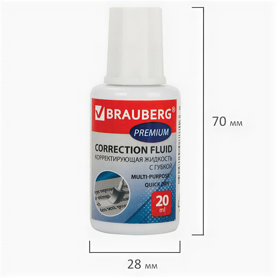 Корректирующая жидкость BRAUBERG "Premium", быстросохнущая, 20 мл, ярко-БЕЛАЯ, с губкой, 224090, 5 штук интересное:
