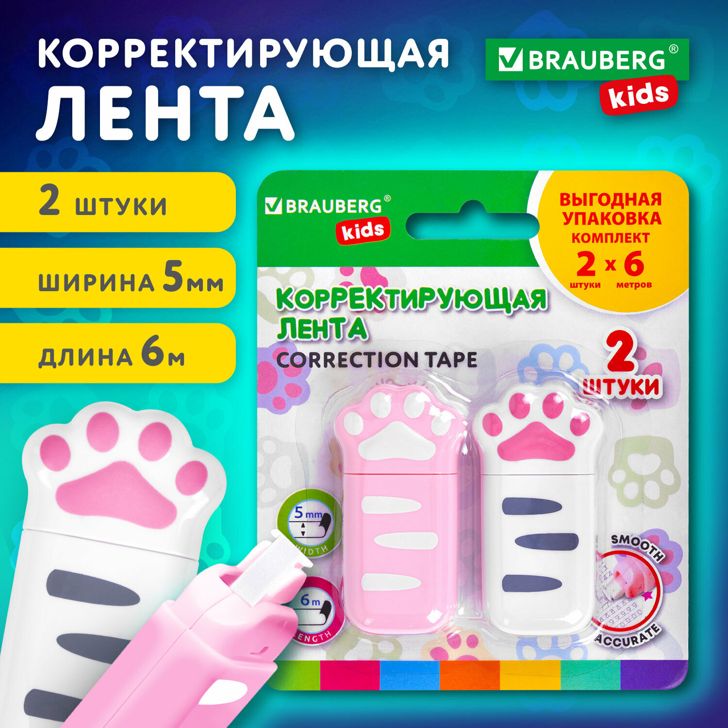 Корректирующая лента BRAUBERG KIDS "лапки", 5 мм х 6 м, выгодная упаковка 2 штуки в блистере, 272498 интересное: