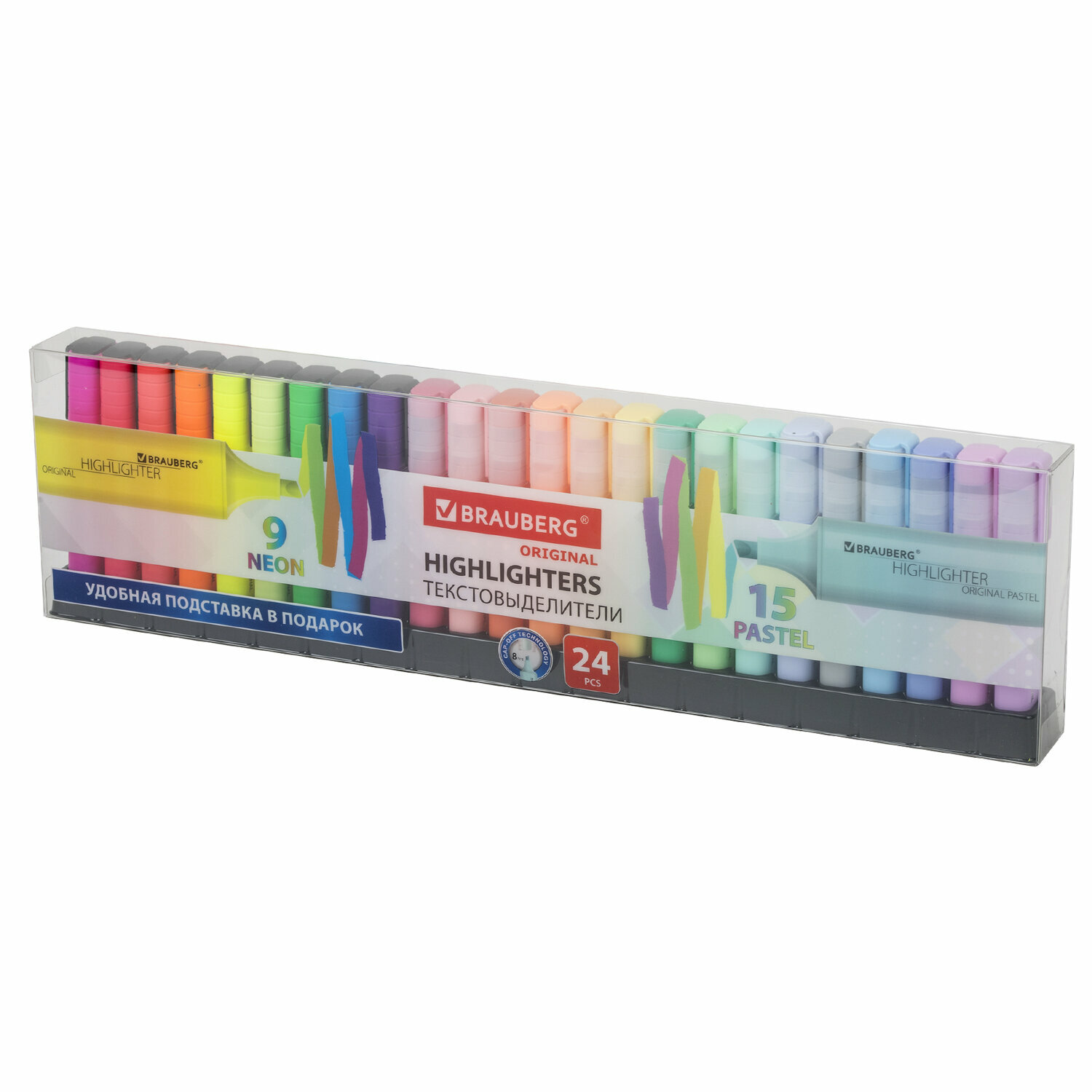 Текстовыделители пастельные и неоновые, набор 24 цвета, маркеры для рисования, скетчинга, выделения текста на подставке, Brauberg Delta, 152506