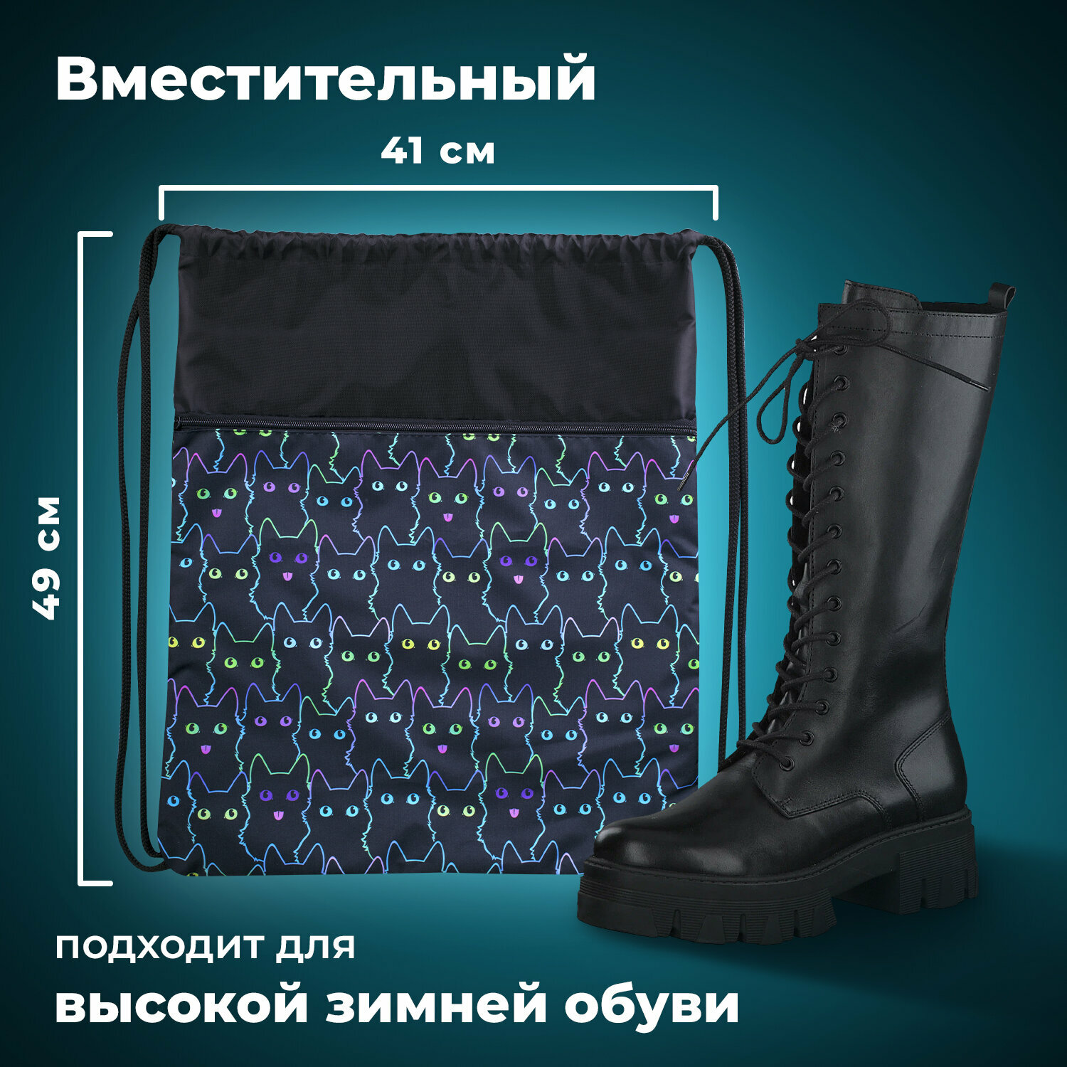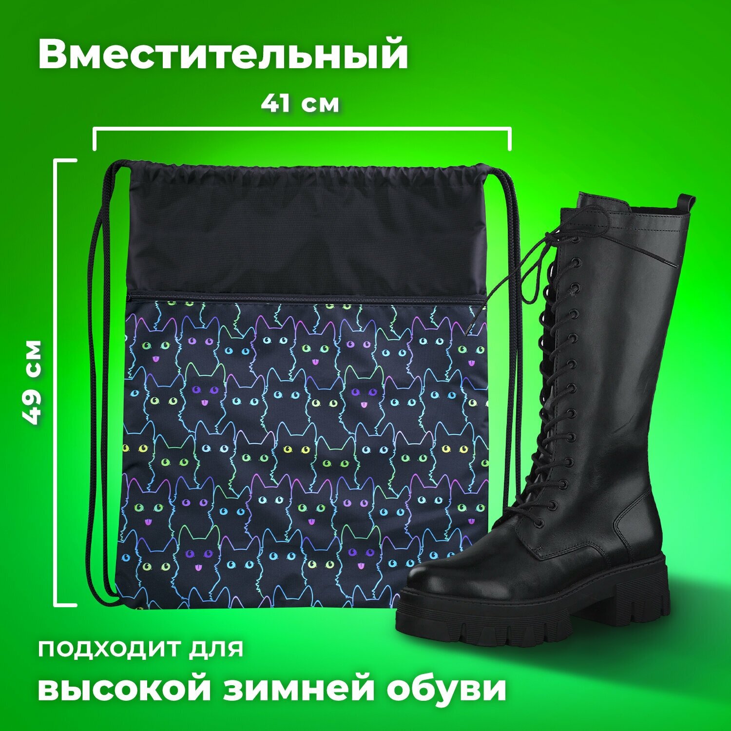 Мешок для обуви Brauberg Dark cat, с петлей, светоотражающая полоса, 2 отделения, 46х36 см (272394)