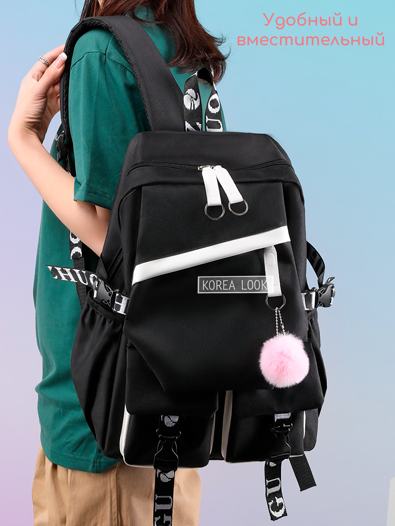 СохранитьГородской школьный рюкзак с помпоном ДВА кармана для учащихся (Черный) интересное: