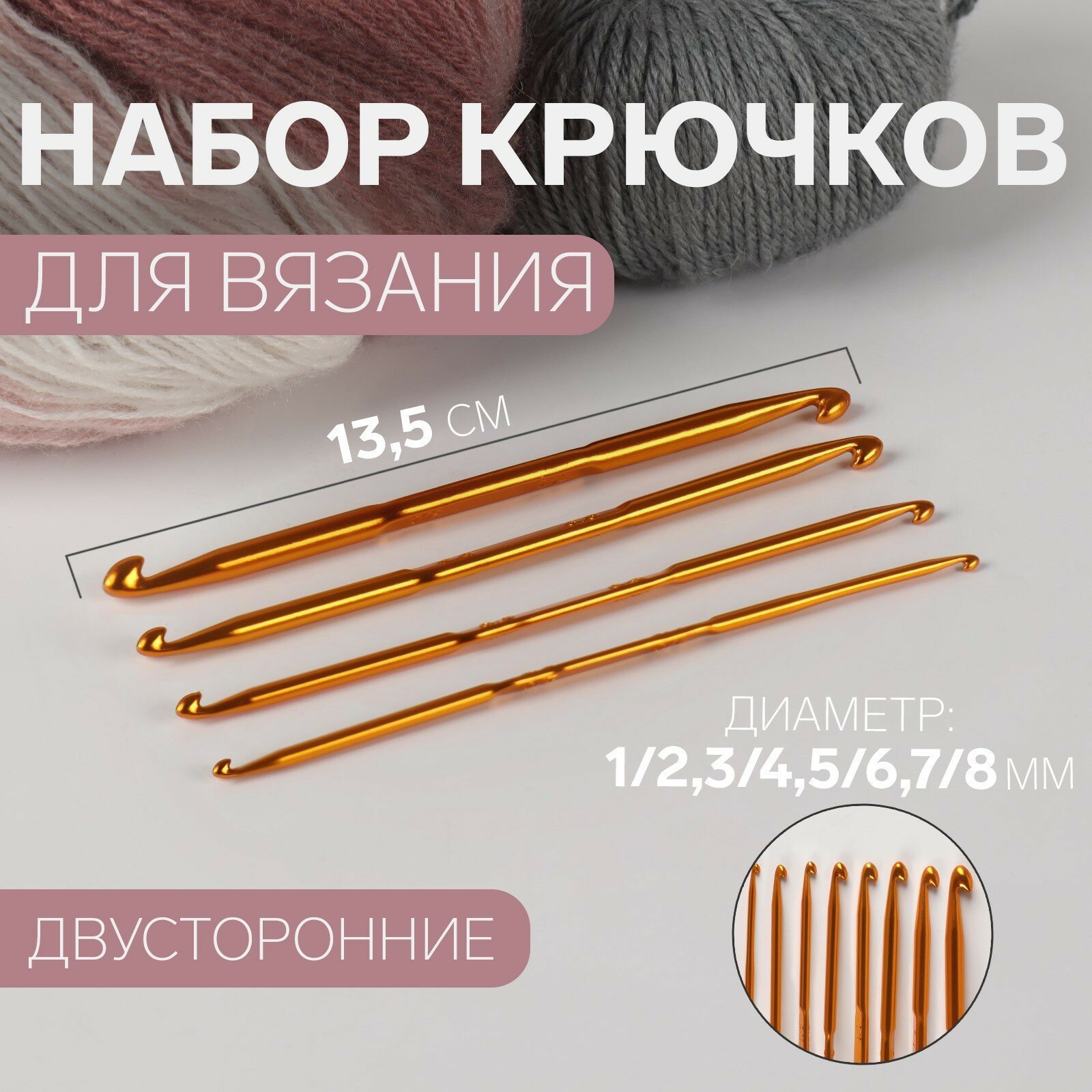 Набор двусторонних крючков для вязания, d 1/2,3/4,5/6,7/8 мм, 13,5 см, 4 шт, цвет золотой интересное: