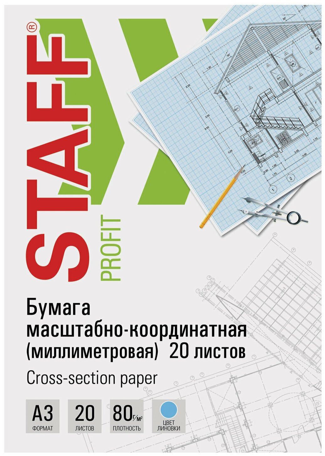 Бумага масштабно-координатная (миллиметровая) плотная папка А3 голубая 20 листов 80 г/м2, STAFF, 113487