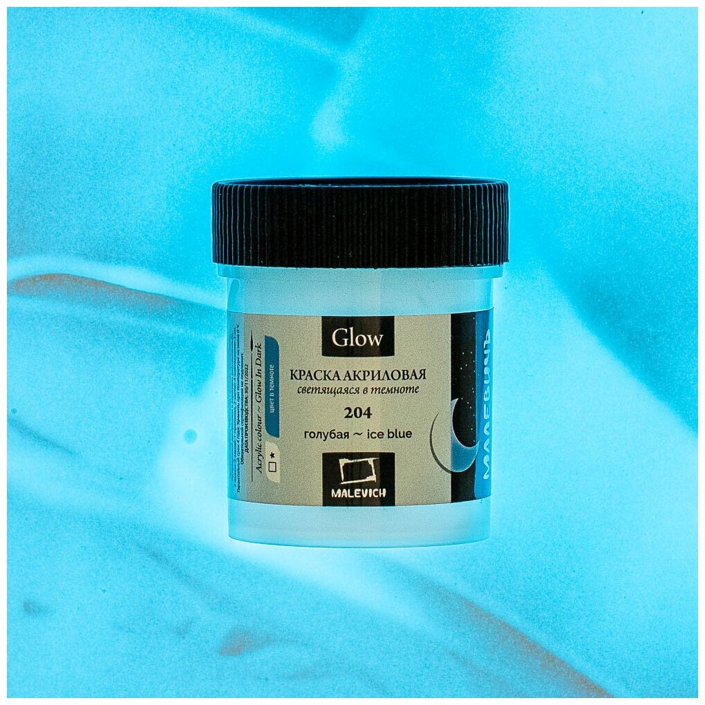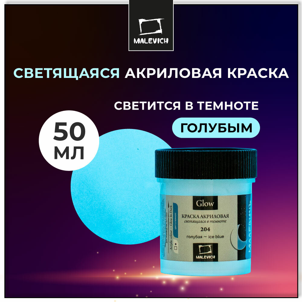 Краска акриловая Малевичъ Glow светящаяся в темноте, голубая, 50 мл