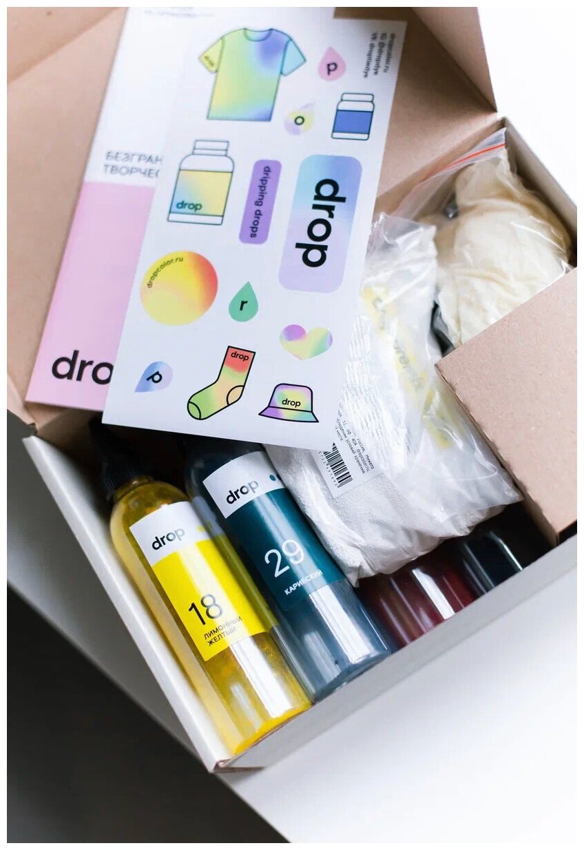 | Комплектация | 6 бутылочек с красителями, активатор для красителей Premix, резинки для закрепления ткани, защитные перчатки, инструкция по окрашиванию |