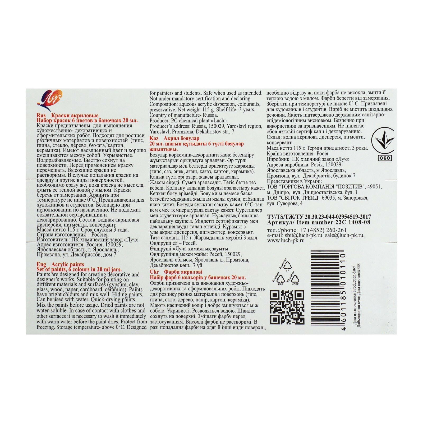 Краски акриловые Луч художественные глянцевые 20 цветов х 20 мл
