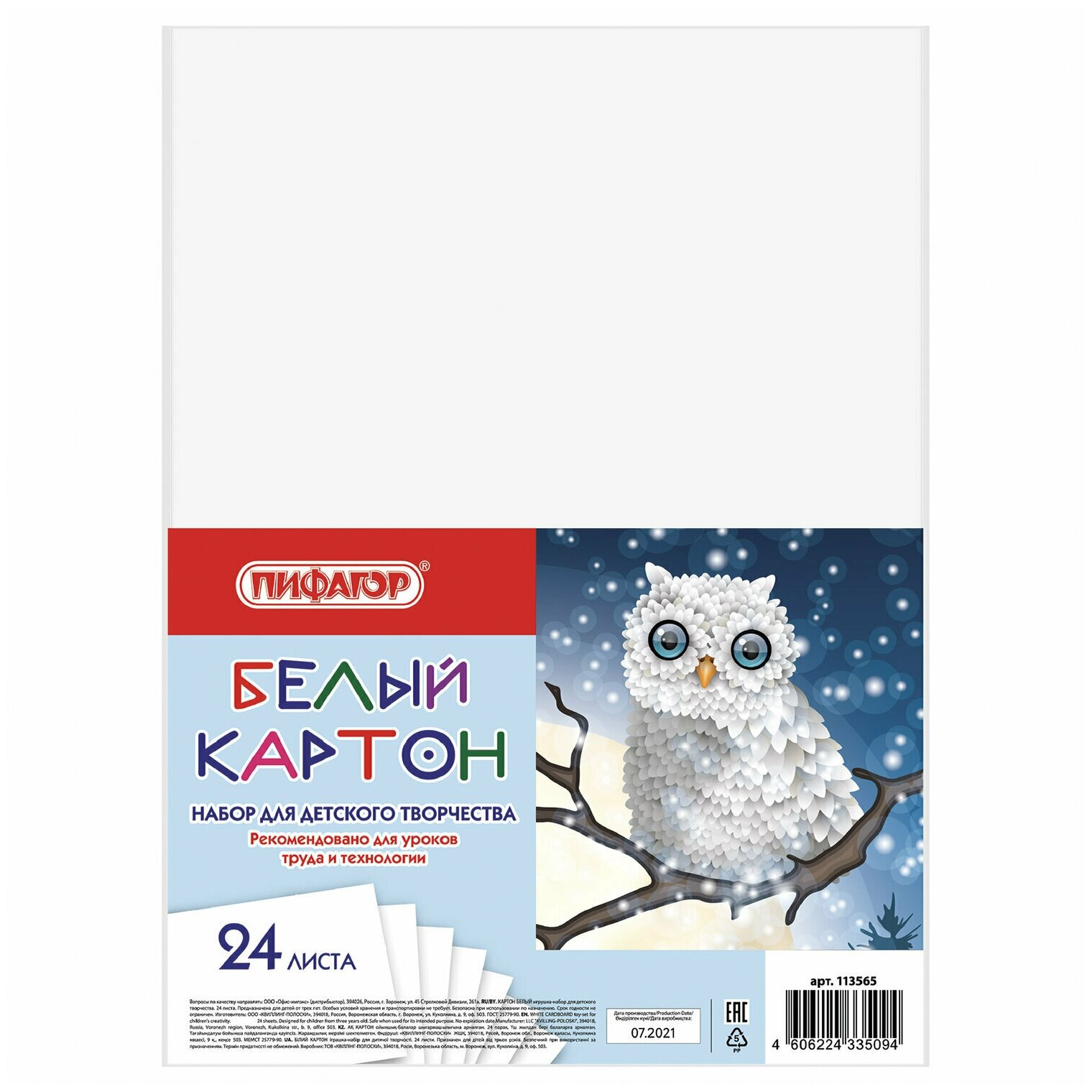 Купить Картон белый А4 немелованный (матовый), 24 листа, пифагор, 200х290 мм, "Совушка", 113565 (арт. 113565)