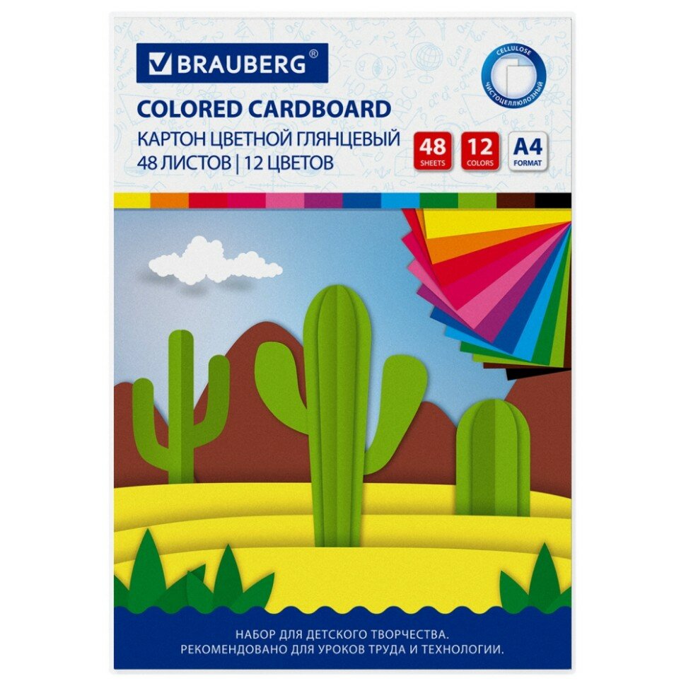 Картон цветной Brauberg А4 мелованный, 48 листов, 12 цветов, склейка, , 200х290 мм, 113552