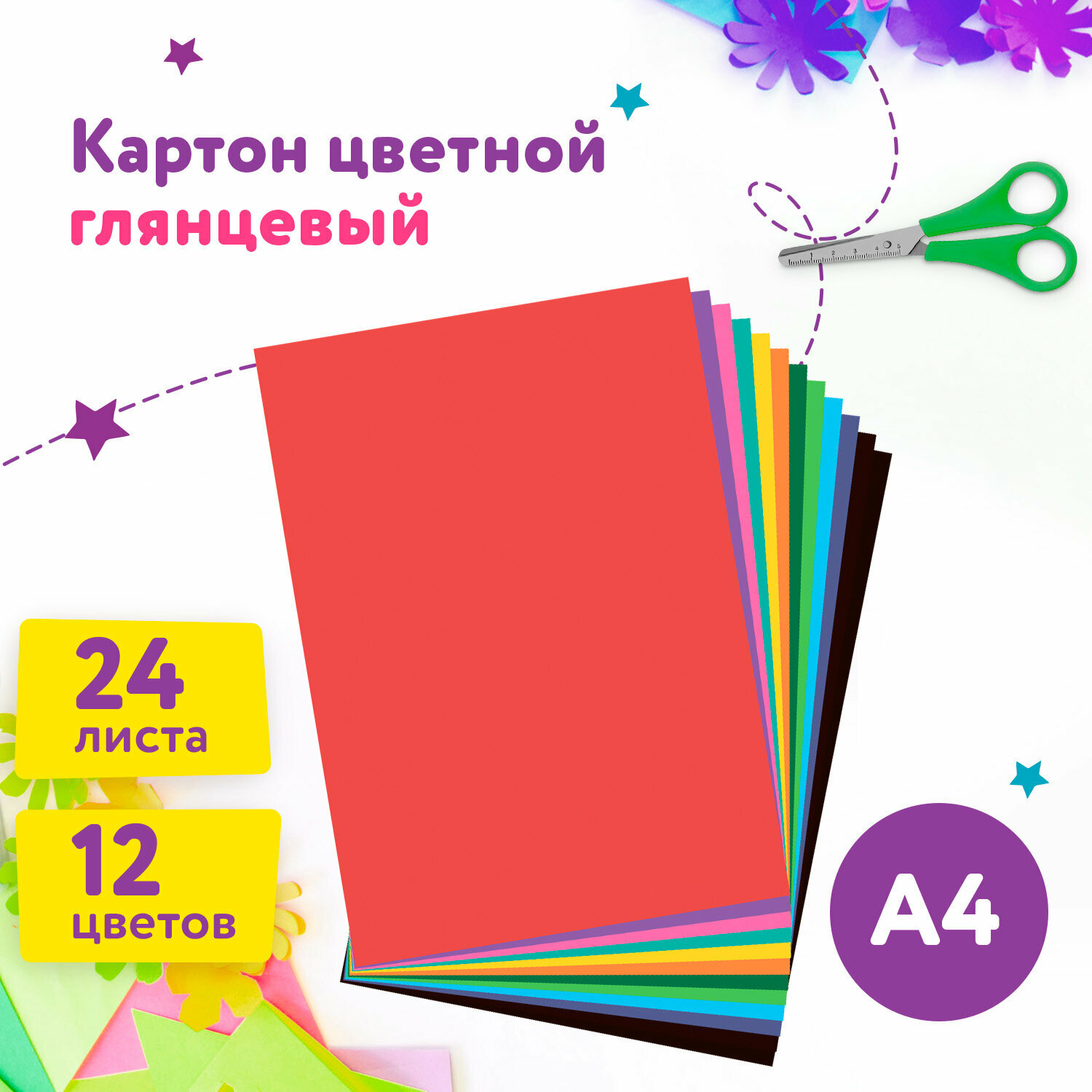 Картон цветной мелованный Brauberg (48 листов, 12 цветов, А4, 200х290мм, склейка) (113552), 2 уп.