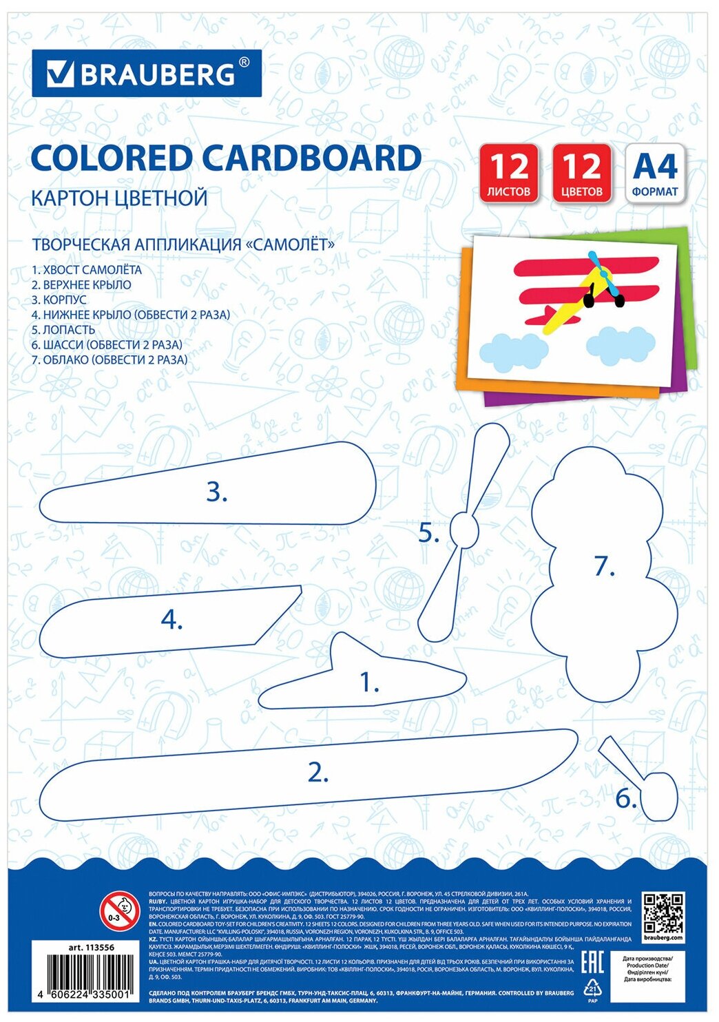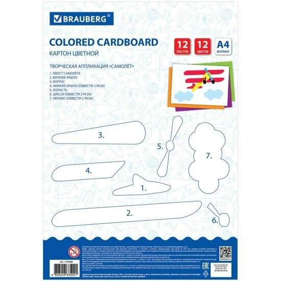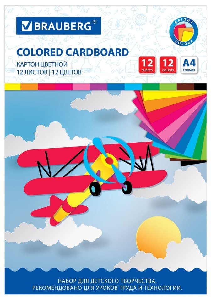 Картон цветной А4 немелованный, 12 листов 12 цветов, в папке, BRAUBERG, 200х290 мм, "Самолет", 113556 интересное: