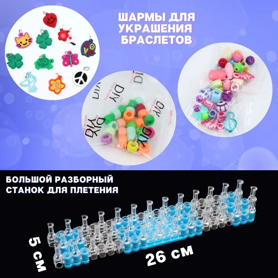 | Состав набора | бусины / крючок / резиночки / станок / шармы |