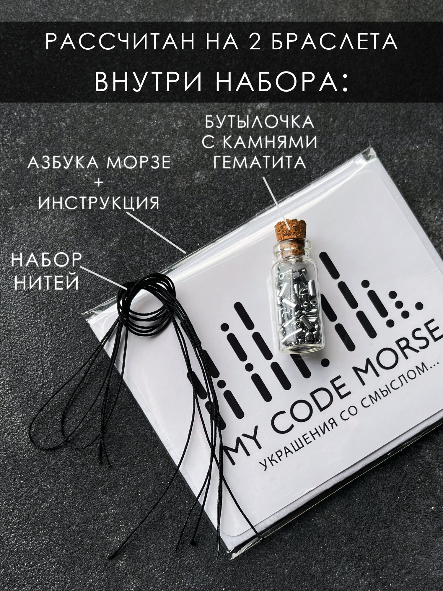 | Комплектация | Азбука Морзе, Инструкция; 2 нити для браслета, 2 нити для застежки; колба с камнями гематита, коробка, ссылка на видеоурок |