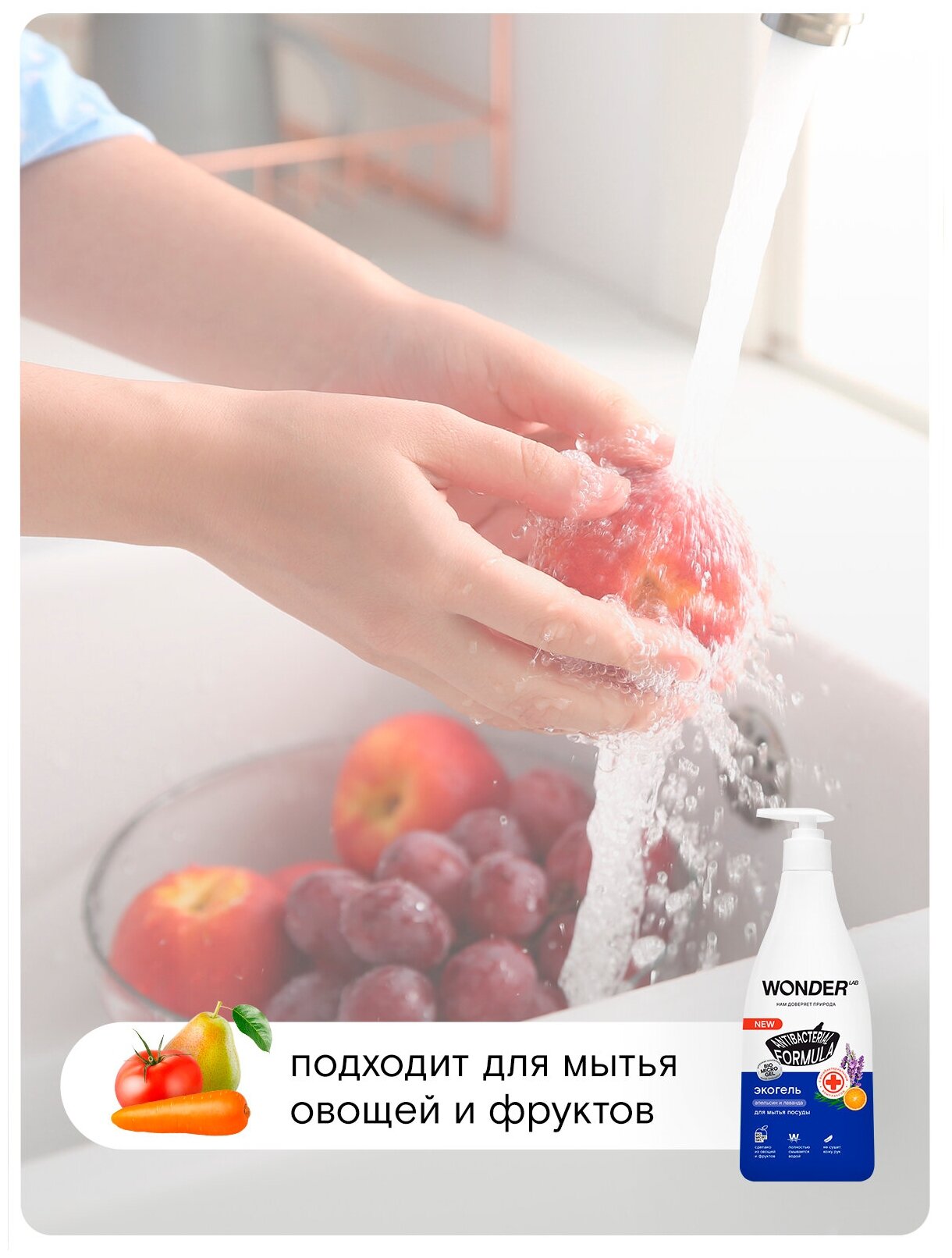Эко гель для мытья посуды овощей и фруктов с нежным ароматом сливочных фруктов WONDER LAB, 550 мл