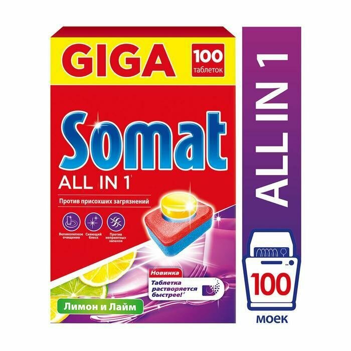 Купить Таблетки для посудомоечных машин Somat All in 1, лимон и лайм, 100 шт