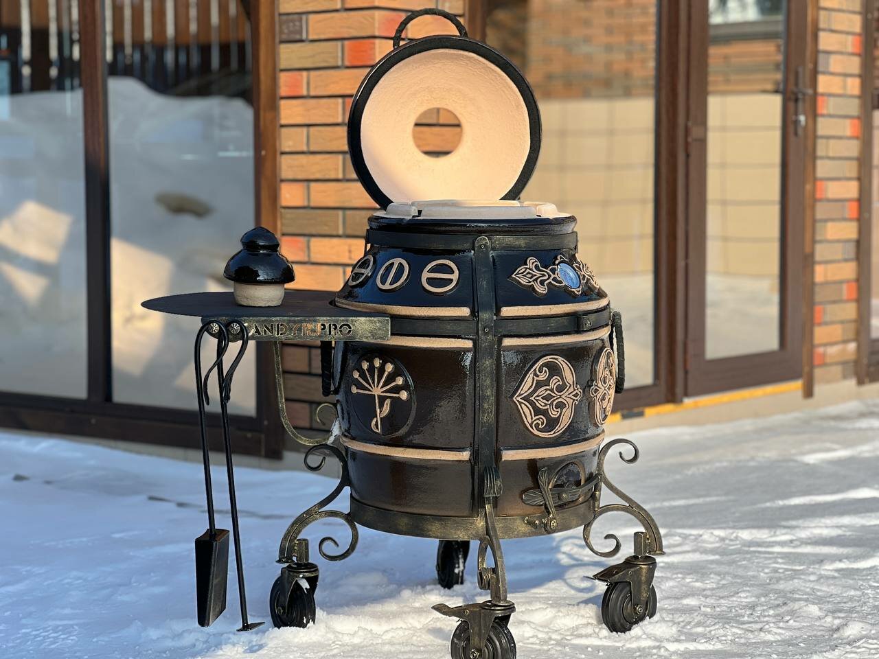Тандыр ЭкоТандыр Уфа с откидной крышкой, на колесах, с металлическим столиком, черный / чехол и сборник рецептов в подарок интересное: