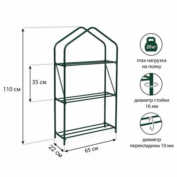 Парник-стеллаж, 3 полки, 110 × 65 × 22 см, металлический каркас d = 16 мм, чехол плёнка толщиной 100 мкм интересное: