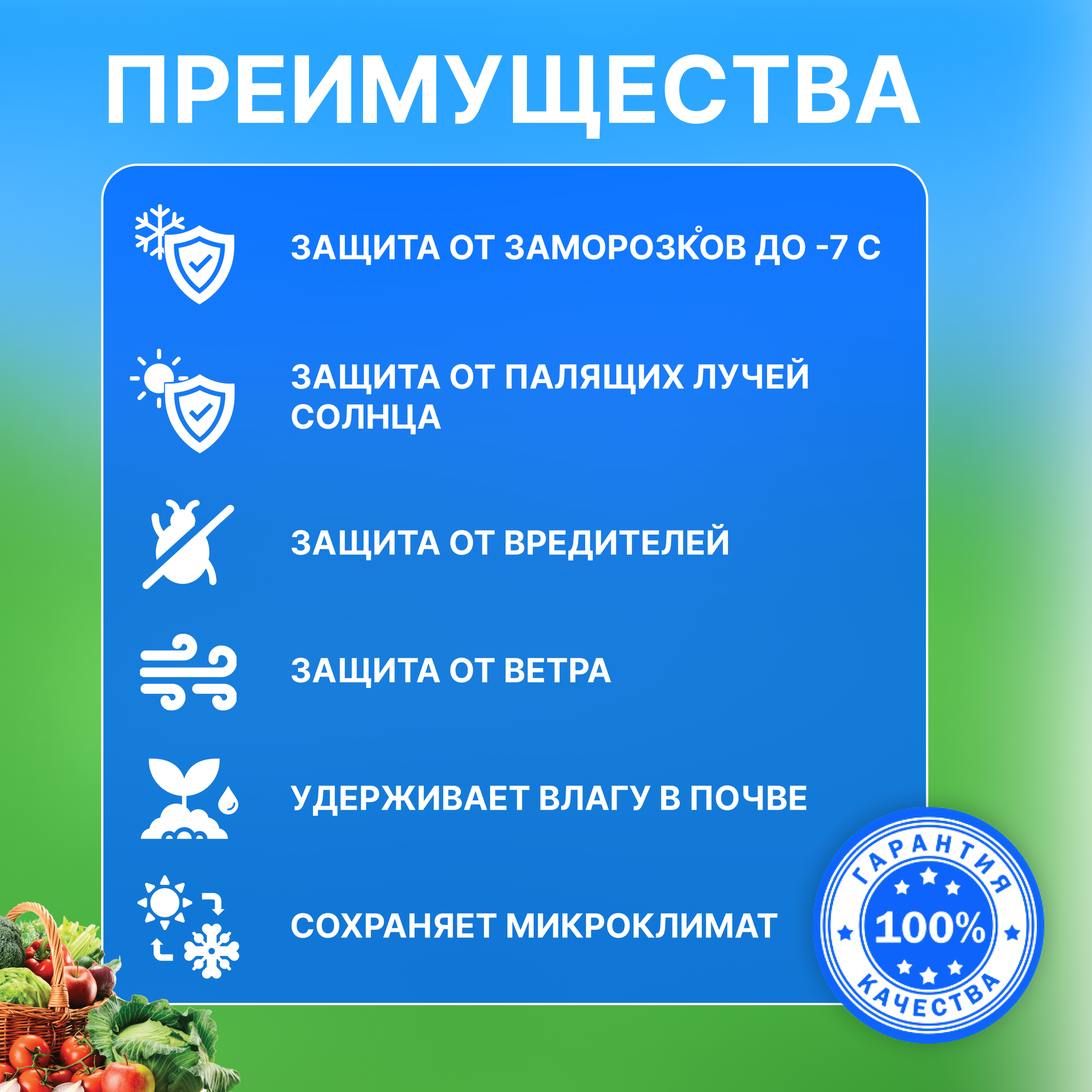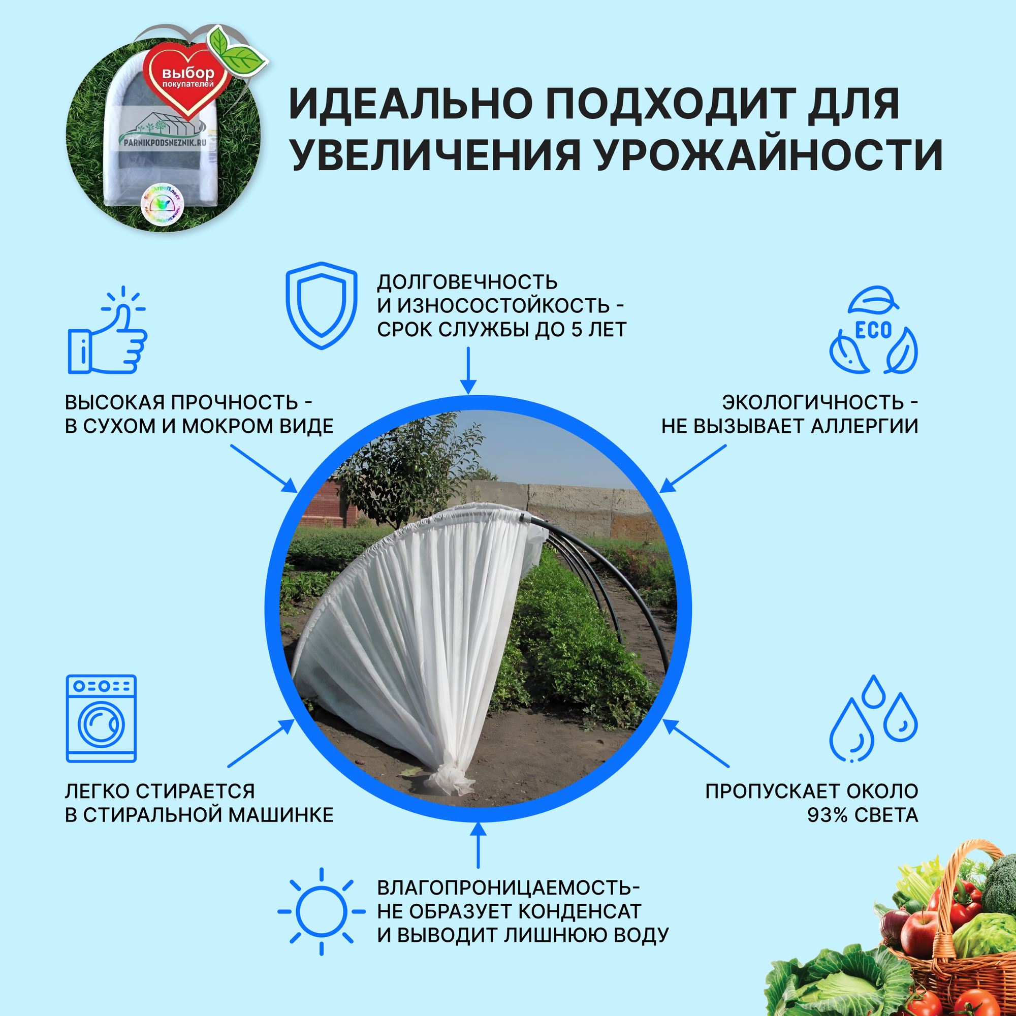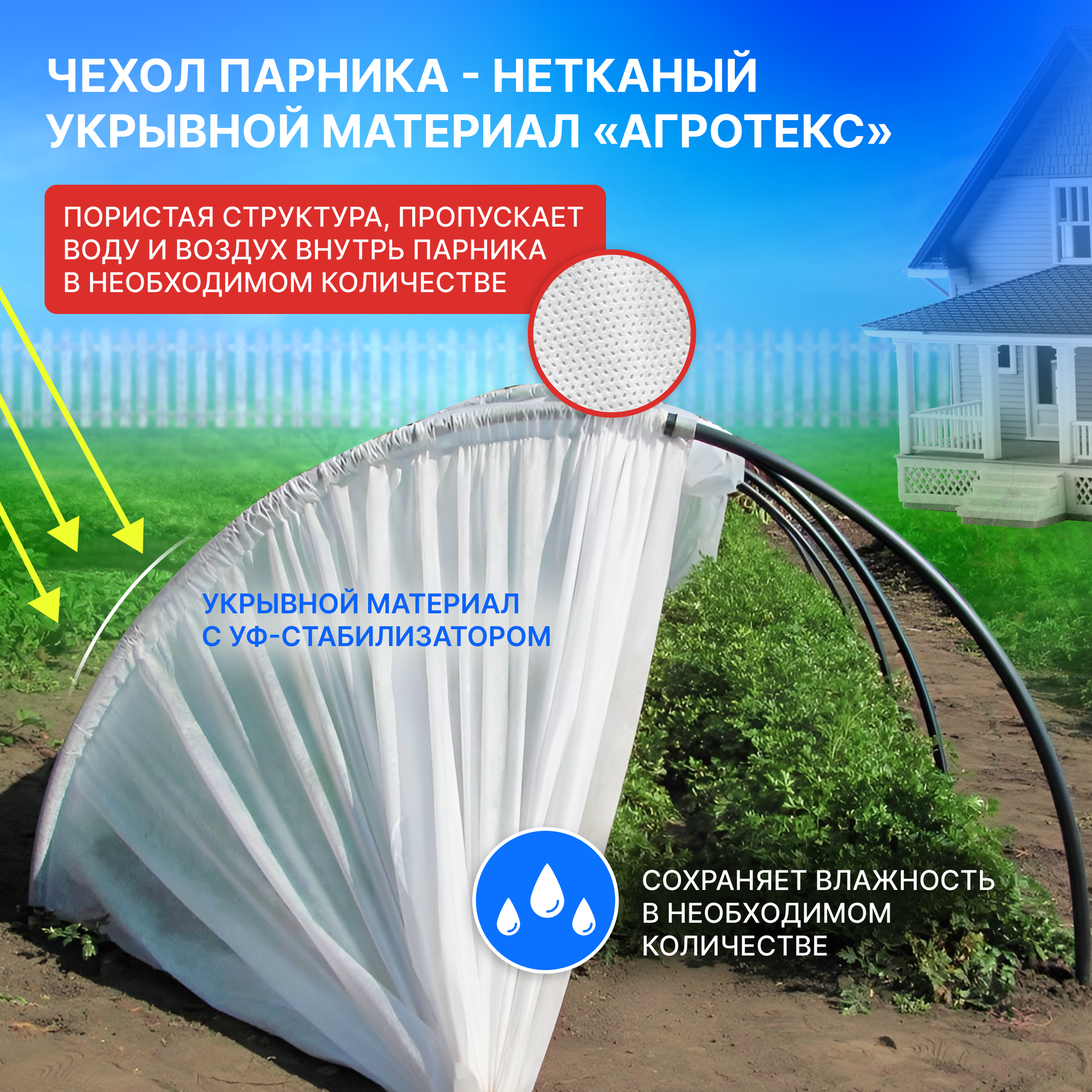 | Комплектация | Агроволокно плотностью 42 г/м2 - 1 шт; дуги ПНД (диаметр 20 мм) - 4 шт; колышки (длина 26 см, 6 см вставляются в дугу) - 9 шт; клипсы (диаметр 20 мм) - 9 шт; упаковочный пакет - 1 шт; инструкция - 1 шт. |