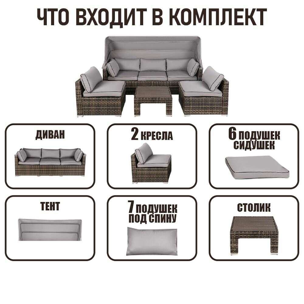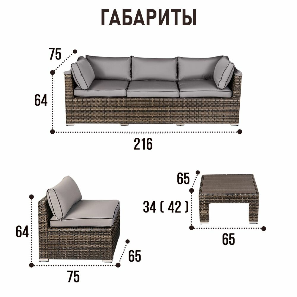 | Комплектация | трёхместного дивана с подушками на сиденье и под спину, к дивану крепится откидной тент; двух кресел с подушками на сиденье и под спину; столика с закалённым стеклом 5мм и с подушкой на сиденье, чтобы получился пуфик. |
