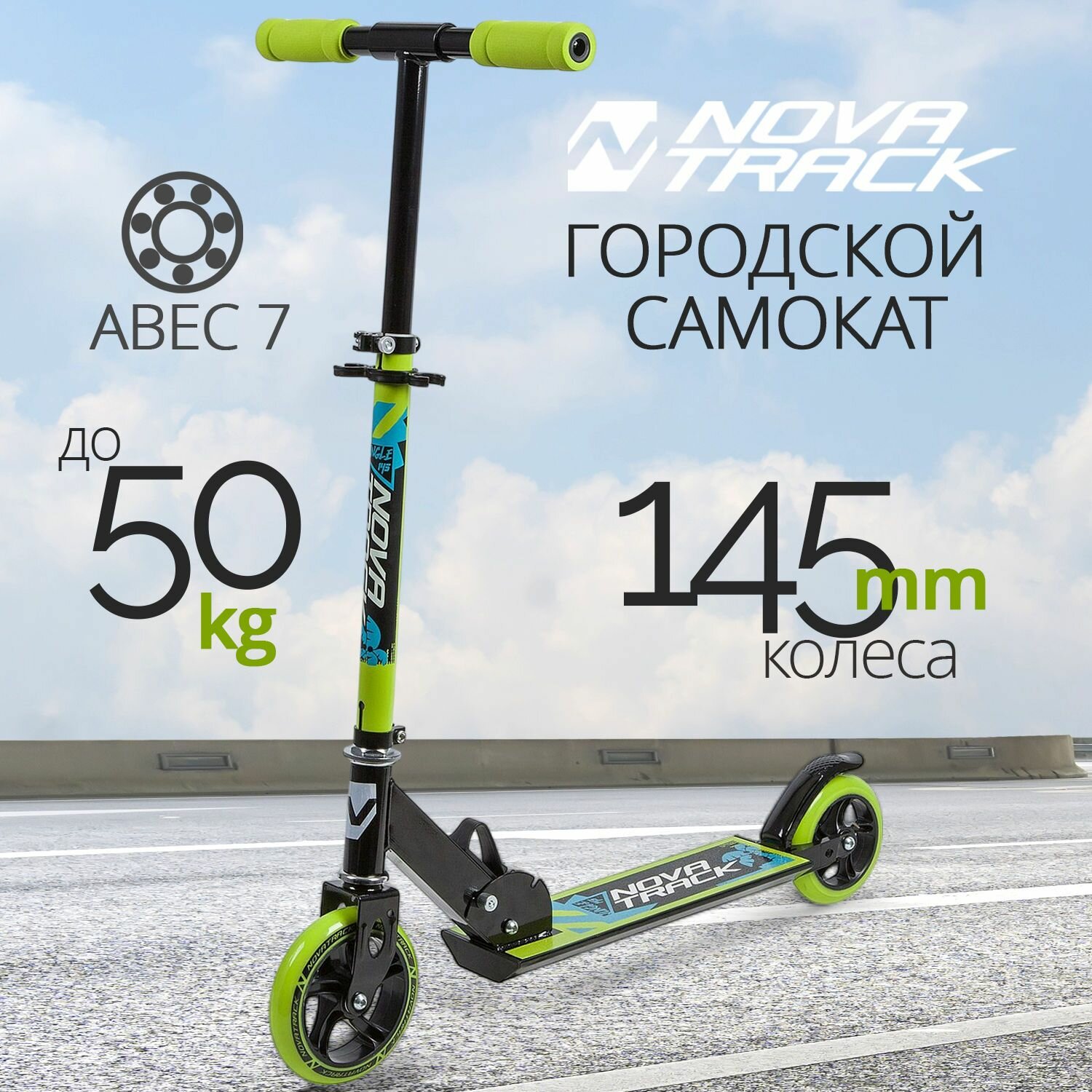 Купить Самокат городской NOVATRACK 145S.JUNGLE.BGN9 сталь, складной, ватер стикер, колеса дизайн.145*125мм