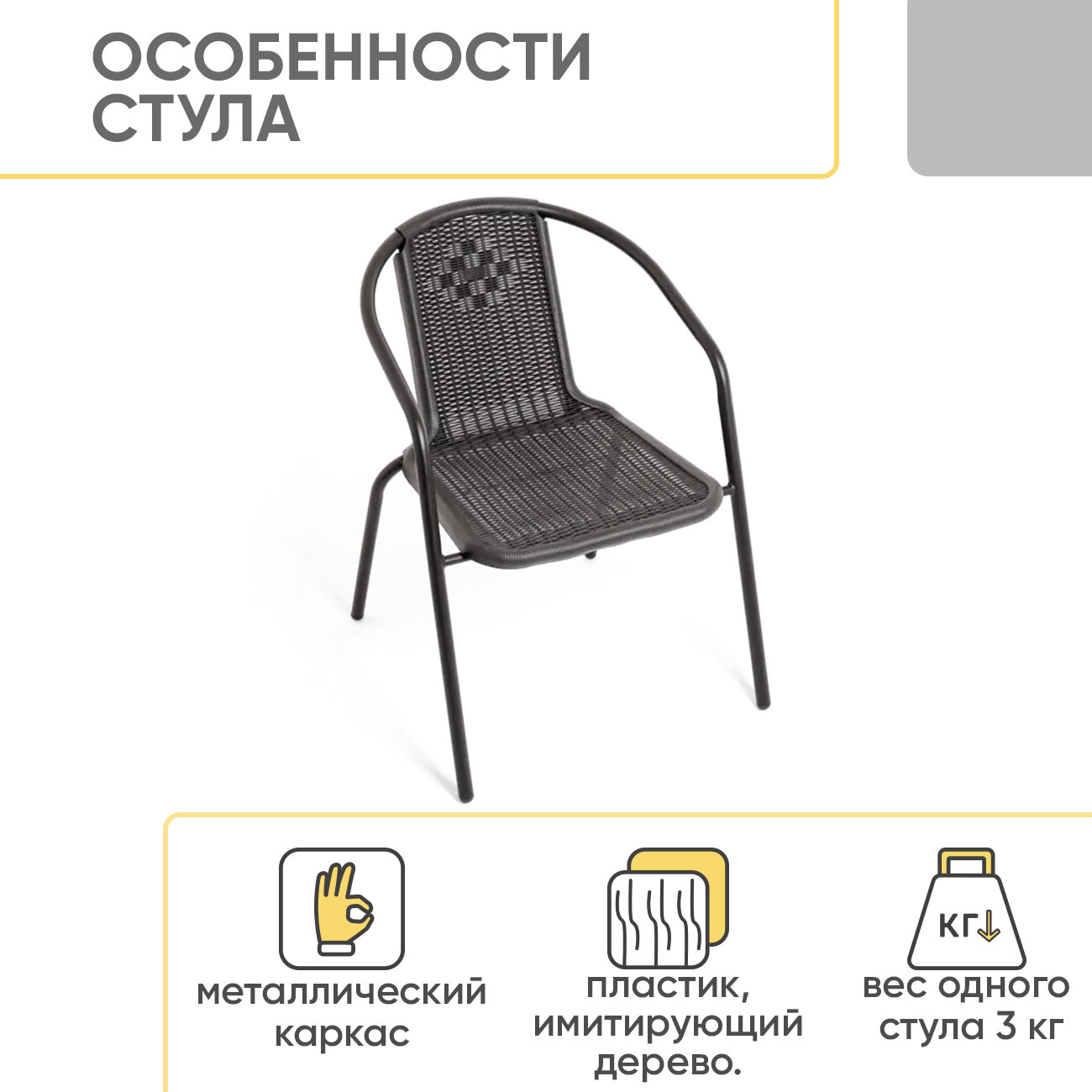 | Дополнительная информация | Вес одного стула 3 кг. |