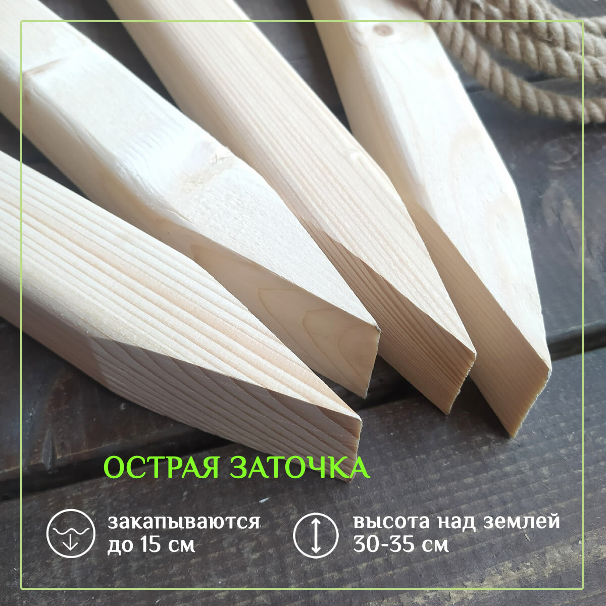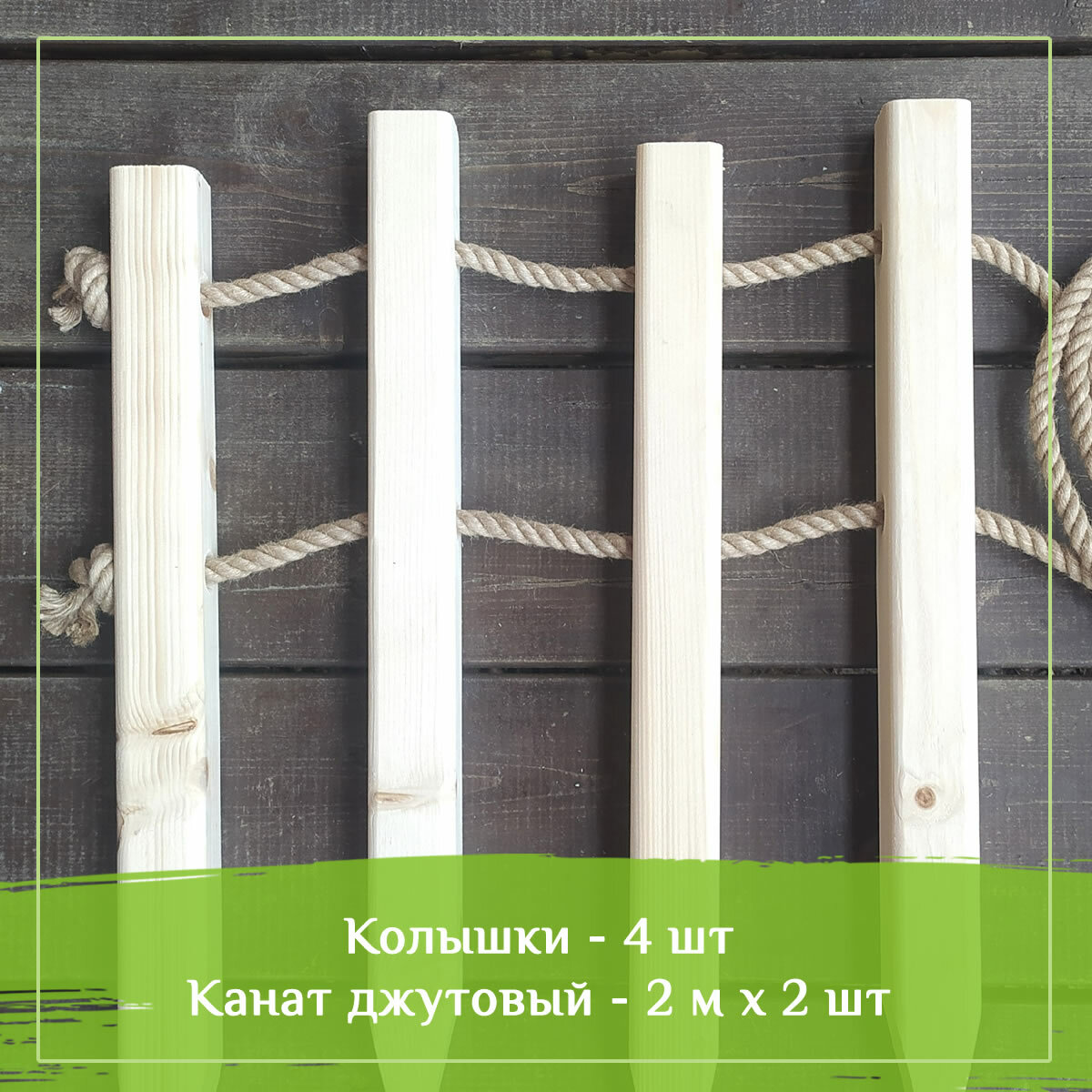 | Подробная комплектация | Столбики-колышки деревянные для ограждения. Канат джутовый |