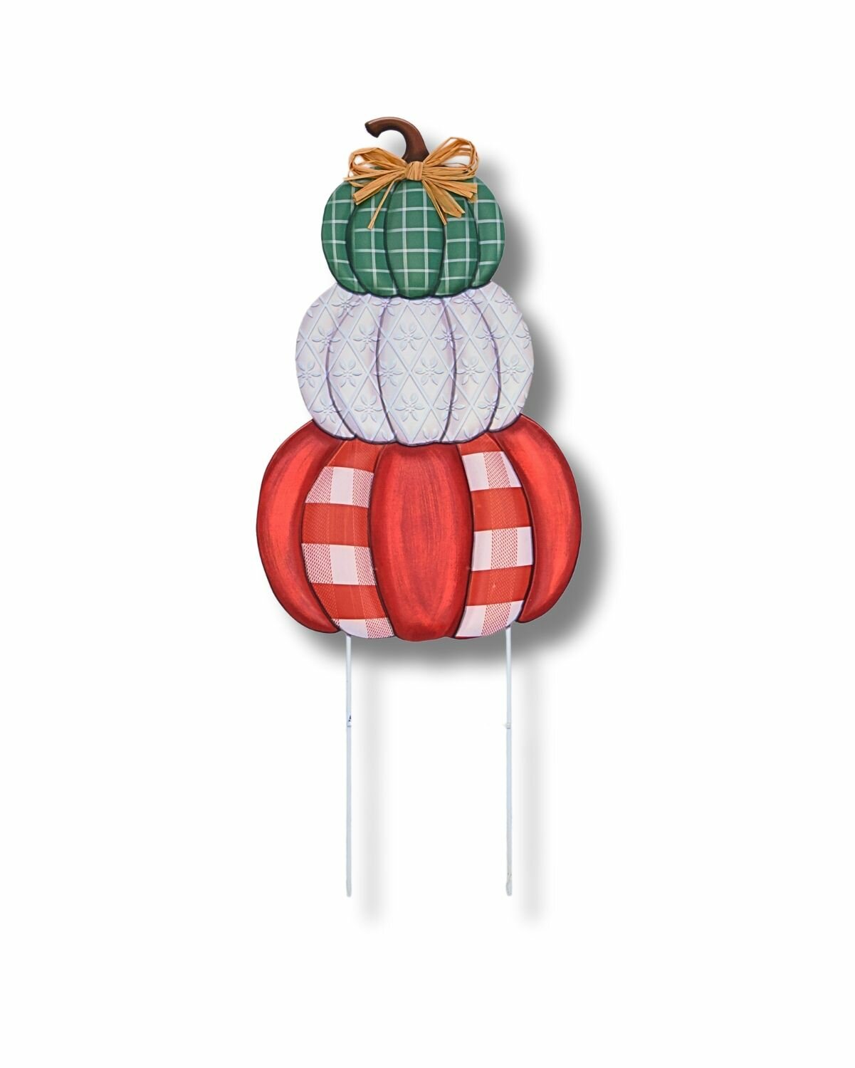 Садовый осенний декор для грядки Три тыквы клетчатые, красный-белый-зеленый (вар.1)