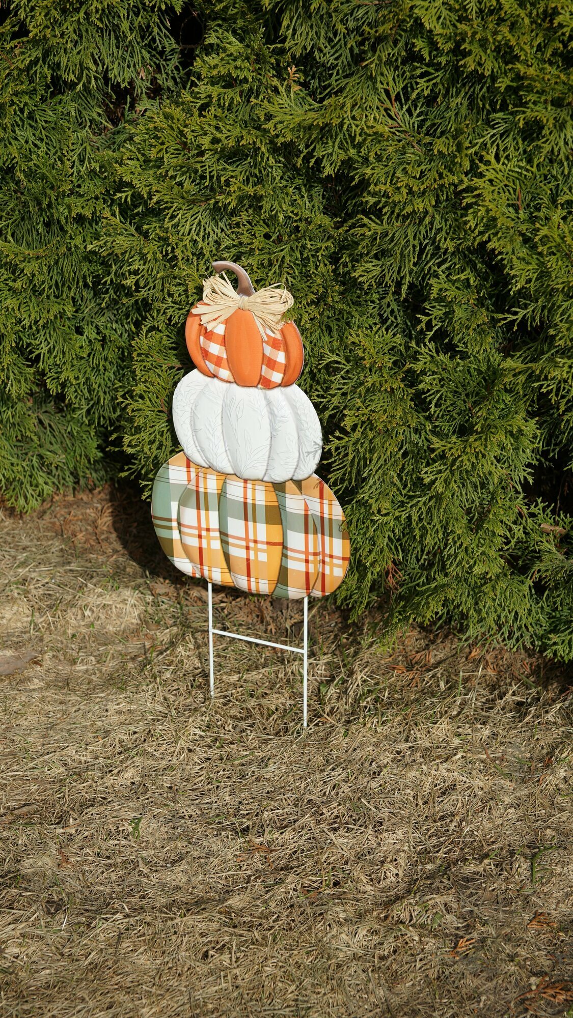 Садовый осенний декор для грядки Три тыквы клетчатые, оранжевый-зеленый-белый (вар.2)