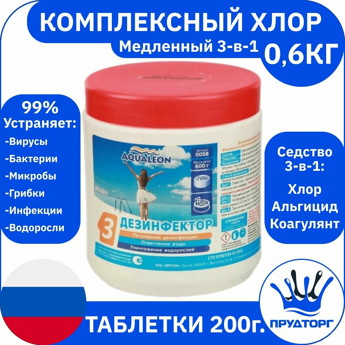 Хлор медленный Дезинфектор для бассейна таблетки (по 200 г) 0.6 кг Aqualeon МСХ - Химия для дезинфекции и очистки воды бассейна / Средство для ухода за водой "Аквалеон"