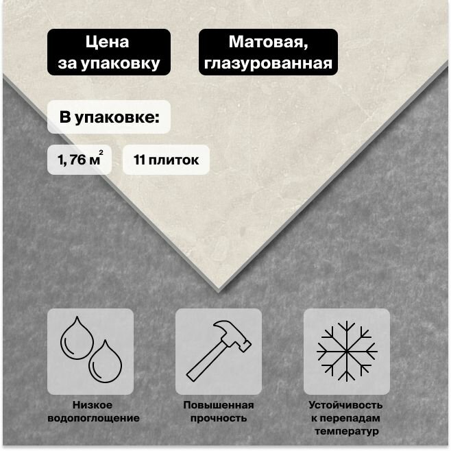 | Дополнительная информация | тон (оттенок) плитки может отличаться от партии к партии; каждая новая партия плитки имеет оттенок, отличающийся от оттенка предыдущей партии в силу особенностей производственного процесса плитки; отличие тона плитки разных партий не является производственным браком продукции |