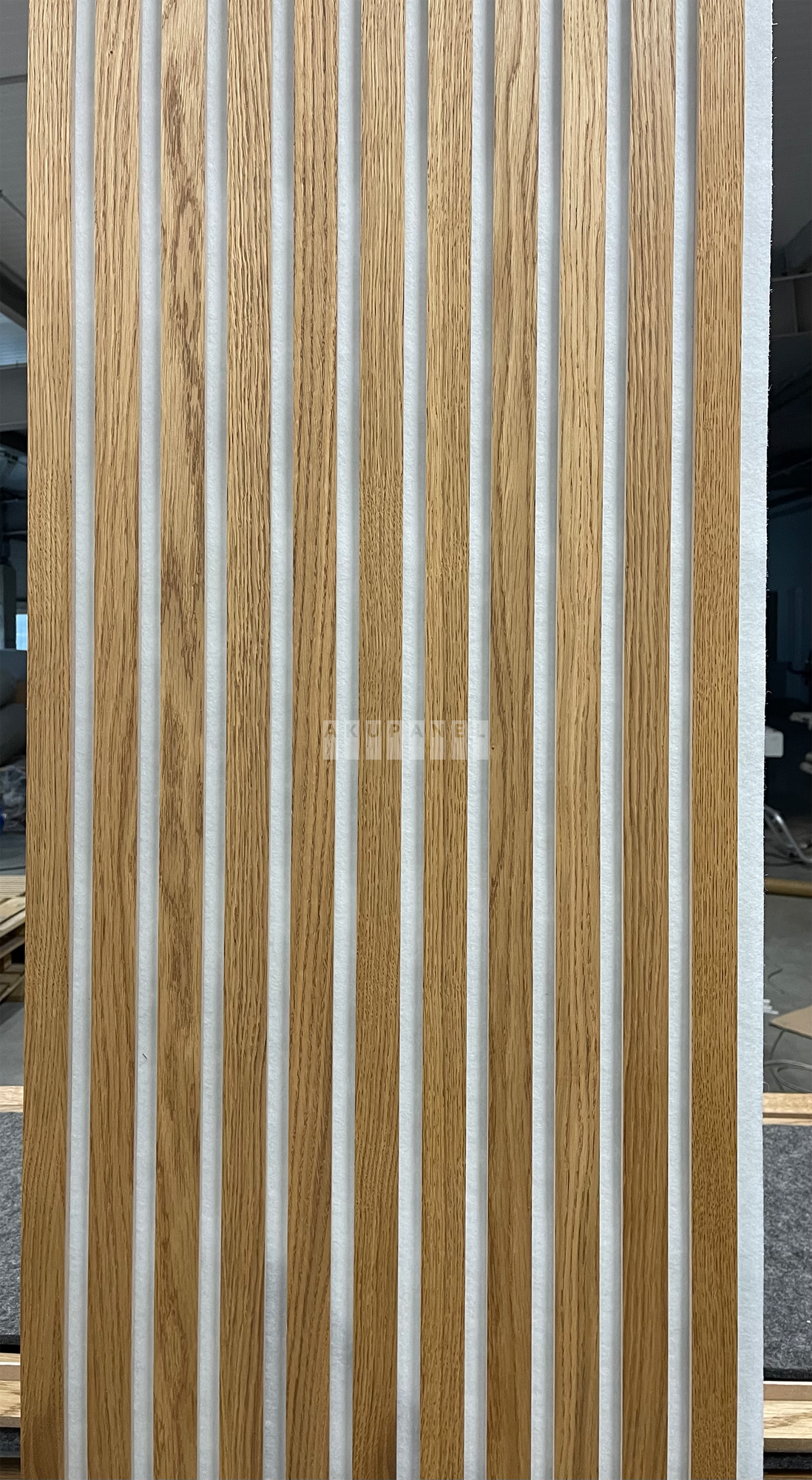 Акустическая реечная панель AKUPANEL - Декоративные рейки (Шпон, Дуб "Бурбон") и белая акустическая панель Акупанель