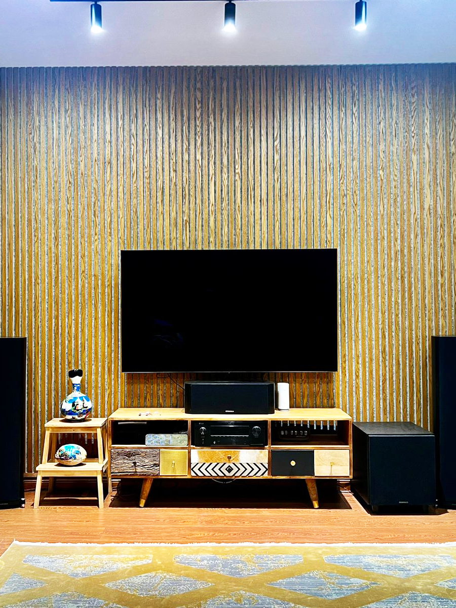 Декоративные рейки (Шпон, Дуб "Бурбон") и черная акустическая панель – акупанель