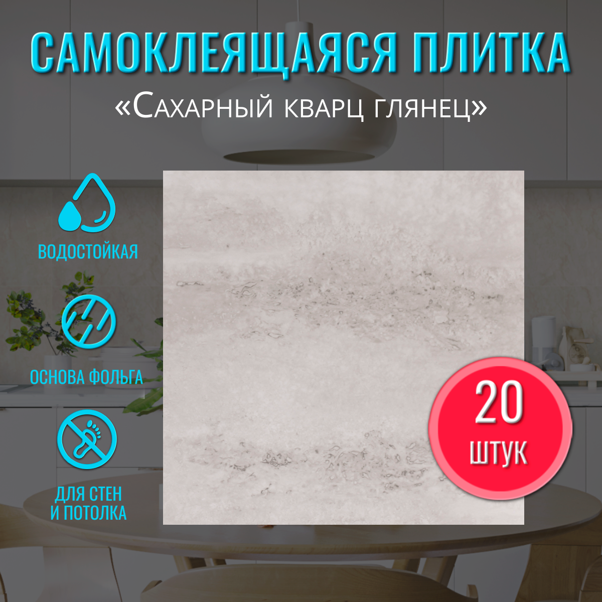Купить Самоклеющаяся панель стеновая для ванной и кухни ПВХ глянцевая "Сахарный кварц" 30х30 см толщина 2 мм 20 шт. самоклеящаяся плитка декор фартук для кухни на стену гибкий камень