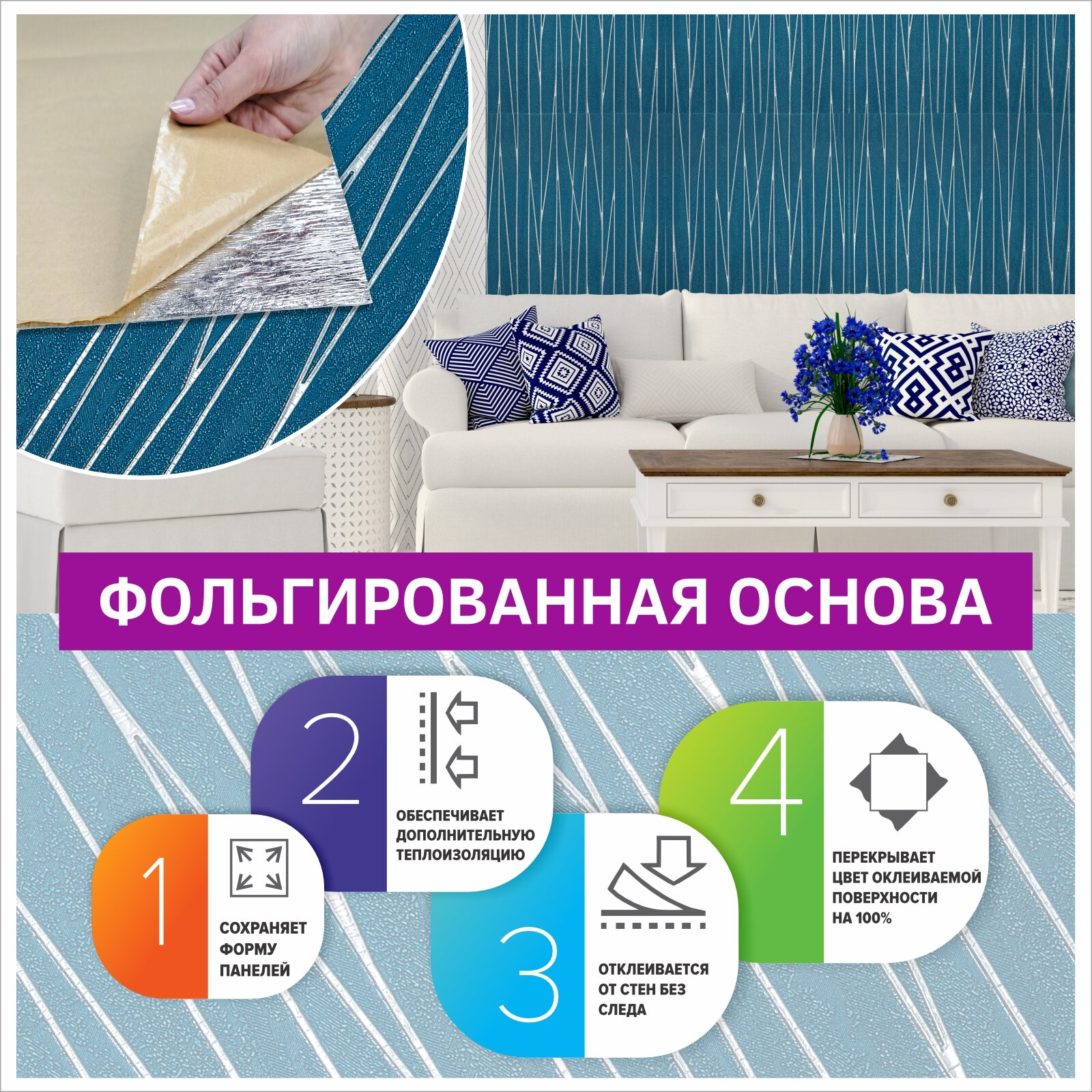 Самоклеющаяся панель для стен мягкая с фольгой "Капелла серебро" 10 шт. 3D 690*690*4 мм самоклеящиеся обои для кухни моющиеся влагостойкие или потолочные плитки