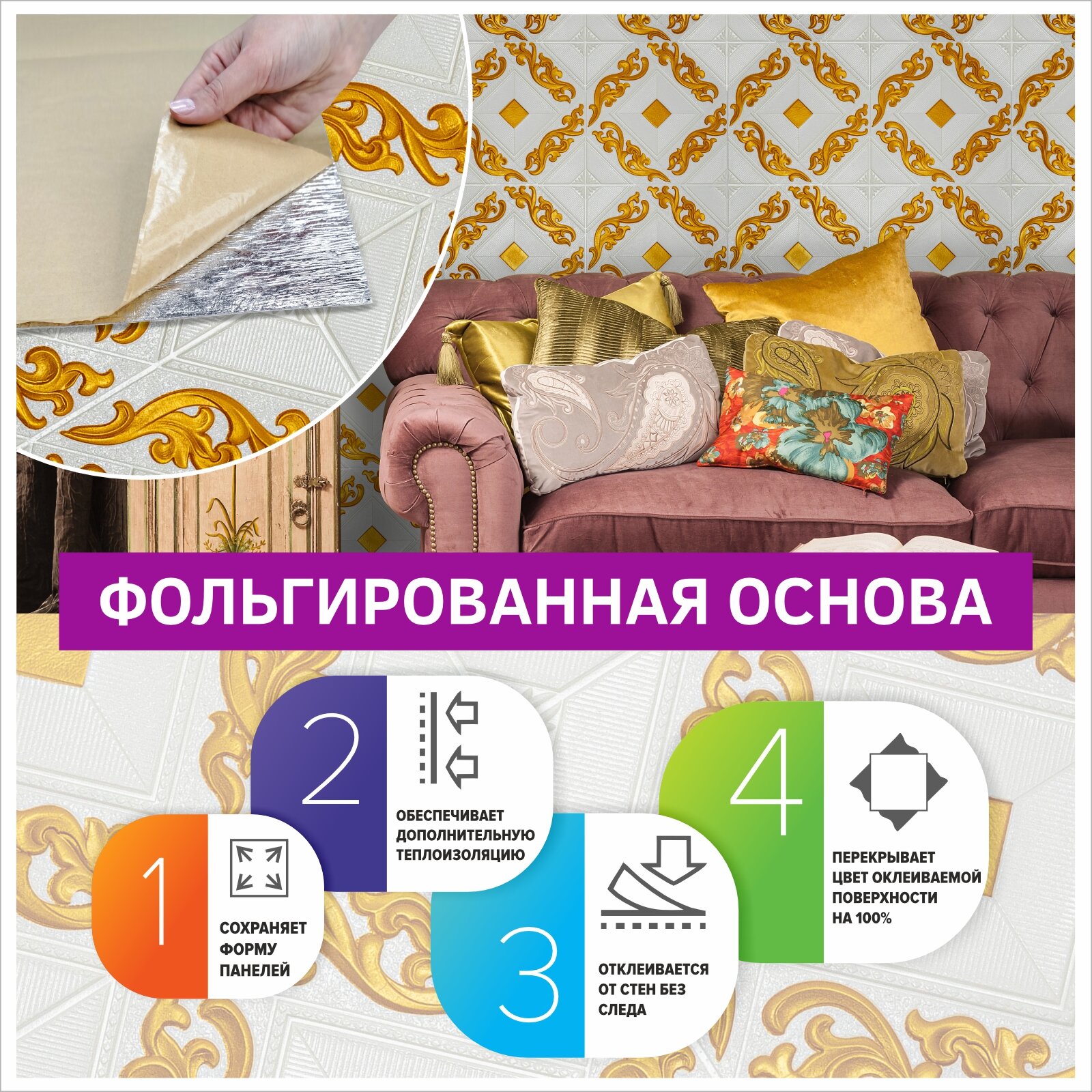 Купить Самоклеющаяся панель для стен мягкая с фольгой "Капелла золото" 10 шт. 3D 690*690*4 мм самоклеящиеся обои для кухни моющиеся влагостойкие или потолочные плитки